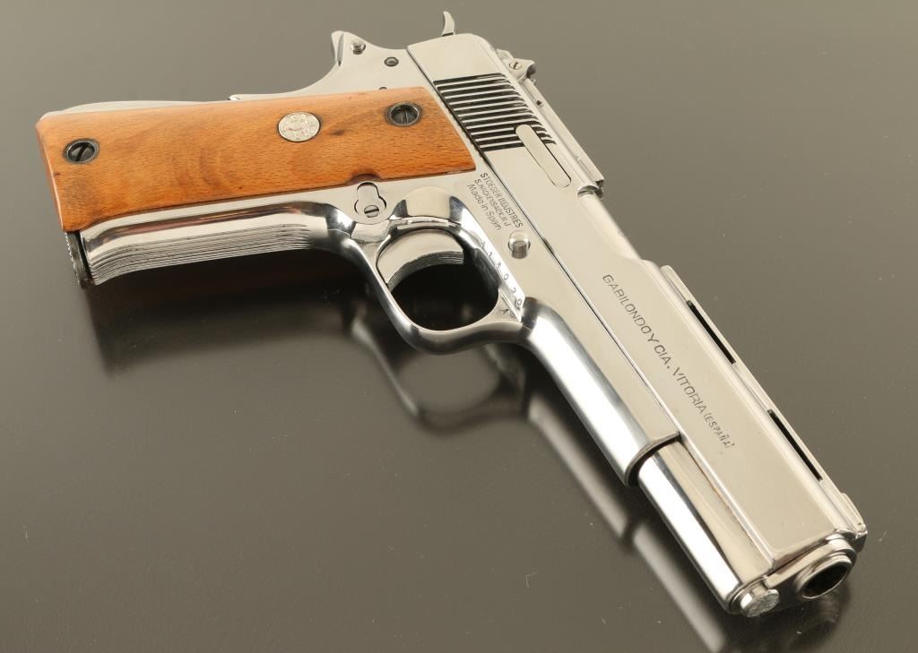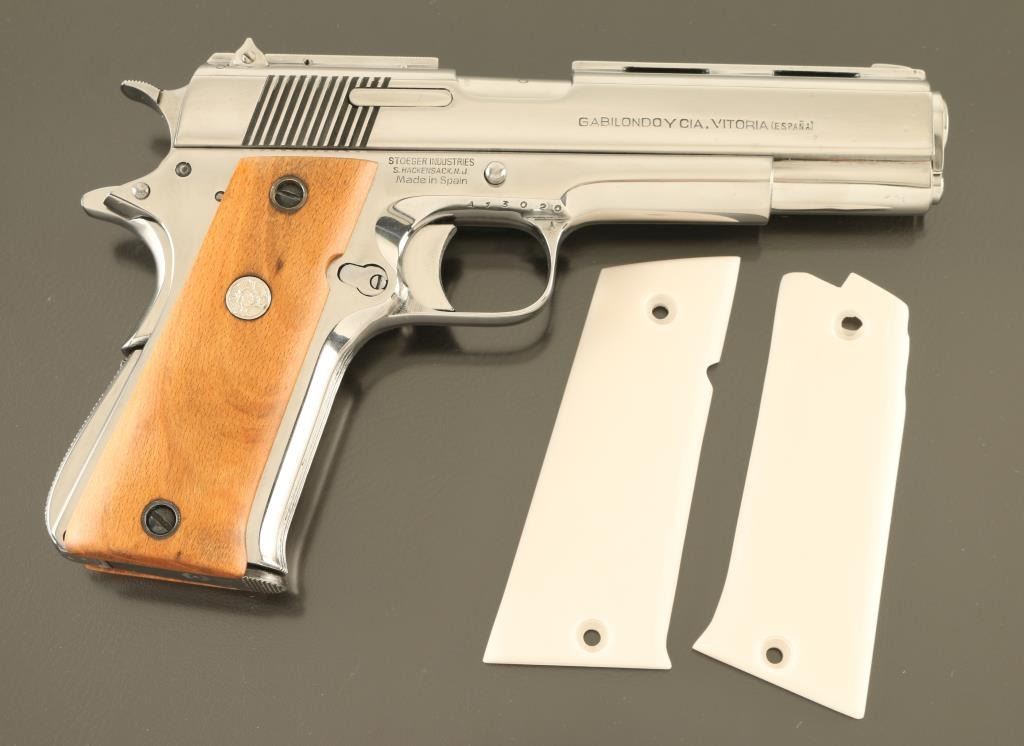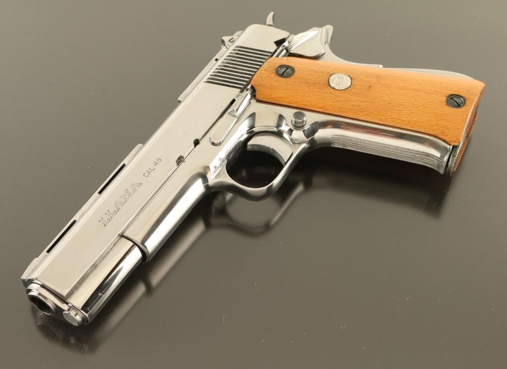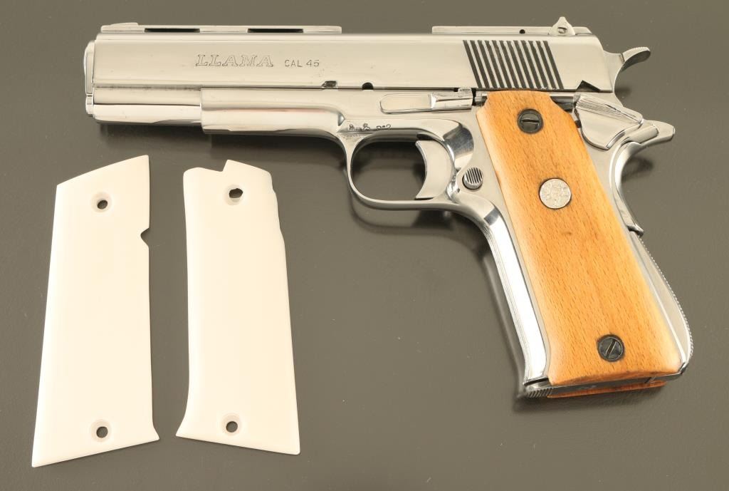 Spanish semiautomatic pistol imported by Stoeger Industries, S Hackensack NJ. Features bright metal finish, smooth wood grips with "LLAMA" logo, single action trigger, 5" barrel, rear sight adjustable for windage, frame mounted manual safety, grip safety. Bore is excellent condition. Appears to have had bluing removed and all metal surfaces highly polished, grip screws and low spots in slide grasping grooves retain their blued finish. Grips are very good condition. Includes extra set of white polymer grips (extra grips might not fit without adjustment). Condition is NRA Very Good as polished *** Modern Firearm ***