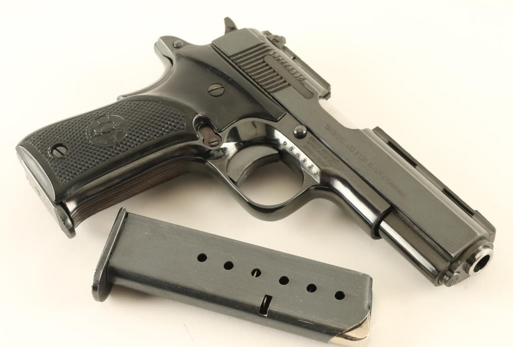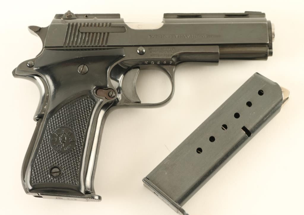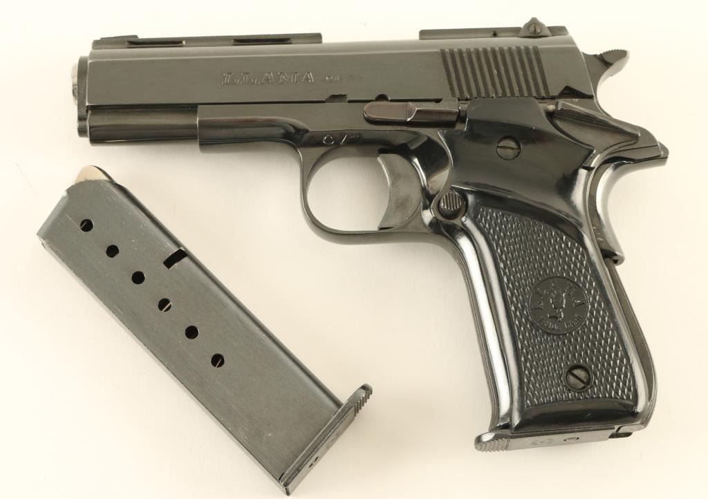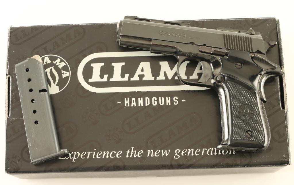 Spanish semiautomatic pistol imported by Stoeger Industries, S Hackensack NJ. Features blued finish, checkered black plastic grips with "LLAMA" logo and thumb rest, single action trigger, 3.75" barrel, rear sight adjustable for windage, frame mounted manual safety, grip safety. Bore is excellent condition. Retains 95% blue with some bare metal at sharp edges, signs of handling. Grips are very good or better condition. Includes factory cardboard box & one spare magazine (2 total). Condition is NRA Very Good+ *** Modern Firearm ***