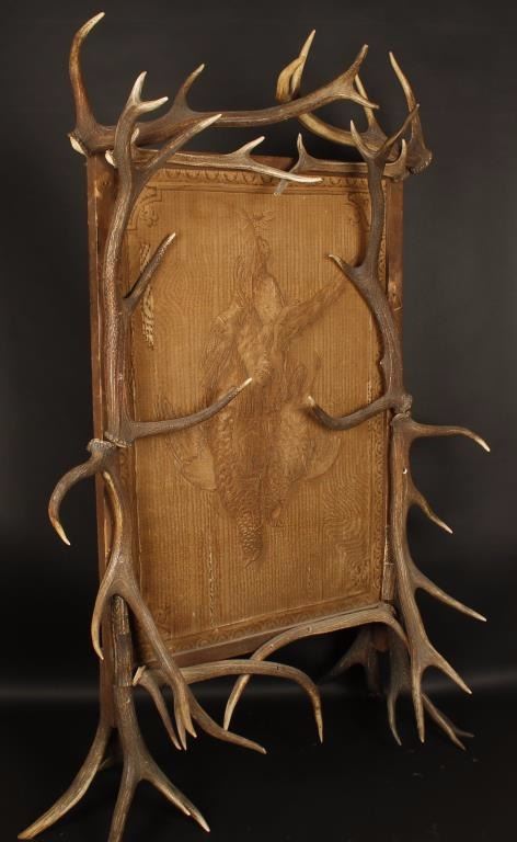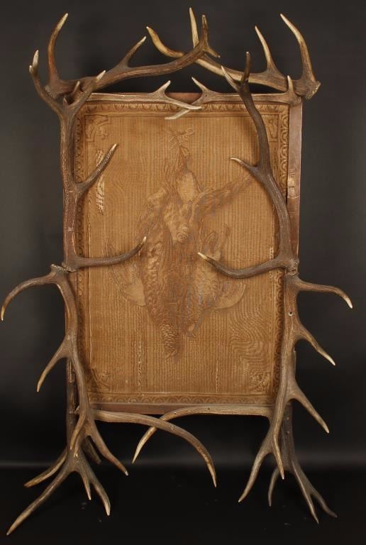 Wood construction accented with buck antlers. Center tapestry has game bird design. Measures 54"x32", in fair condition. Antlers need to be re-affixed in certain areas.