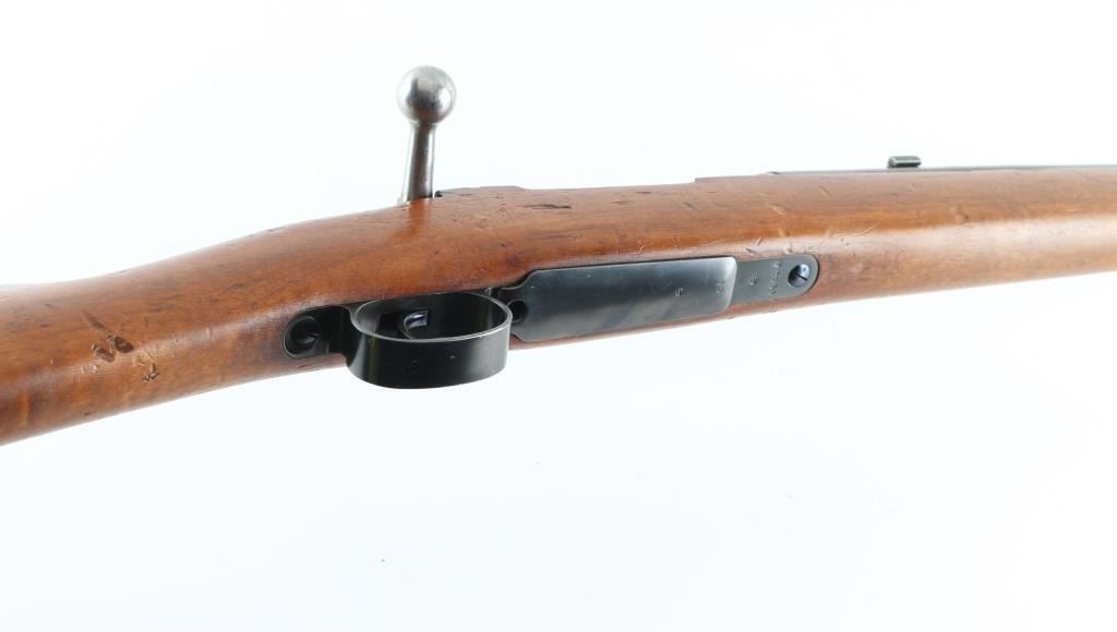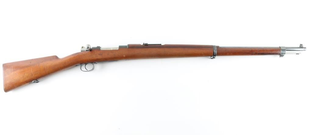 Chilean military rifle made by Ludwig Lowe, Berlin Germany. Features 29" barrel, sling swivels, manual safety, military style sights, cleaning rod under barrel. Bore is excellent/bright with strong rifling. Retains 99% blue. Bolt is polished. Wood is good condition with minor small dents and nicks. Chilean crest and on receiver. Matching numbers on bolt, bolt sleeve, receiver, stock, floorplate, triggerguard,and cleaning rod. Chilean crest "1895" cartouche on left buttstock. No import marks observed. NRA Condition-Very good+ Antique Firearm.