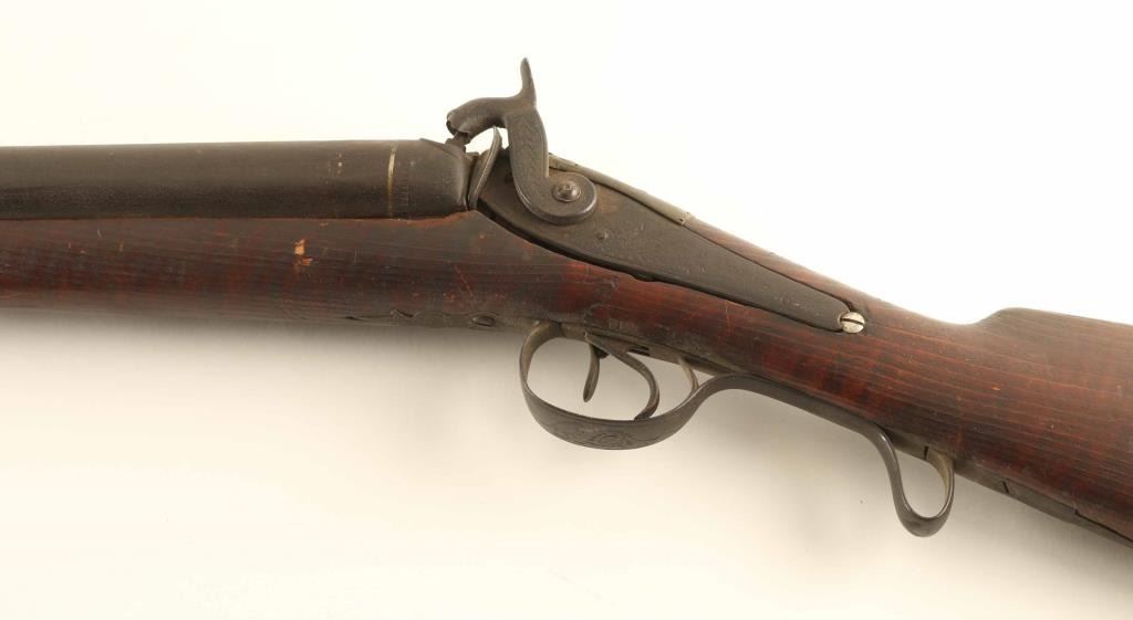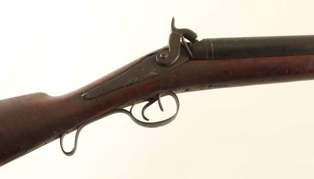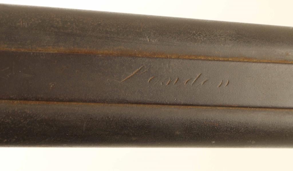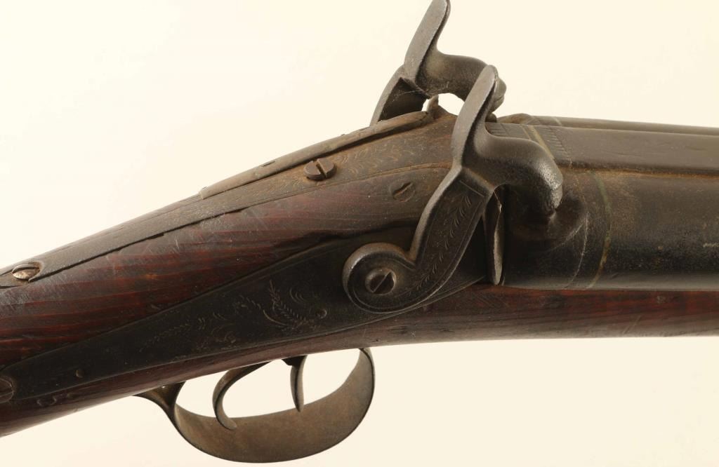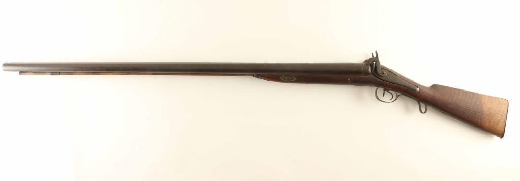 Shotgun. Vintage English made percussion shotgun, with exposed hammers. A massive gun, 40" barrels. 56" overall. Double triggers. Barrel rib marked "London" in script. Both hammers are a little loose, and don't lock up tight. Bores appear dark/dirty. Metal finish has turned a dark brown patina. Wood ramrod has been shortened, and appears non-original to the gun. The right retaining pin plate is missing from the right forearm, and is cracked. Repaired with a piece of brass. Two non-original screw's are behind both lock plated. The wood between the left lock plate, and tang has been repaired with a piece of metal. Wood has minor scratches/chips. NRA Condition- Good. Antique Firearm.