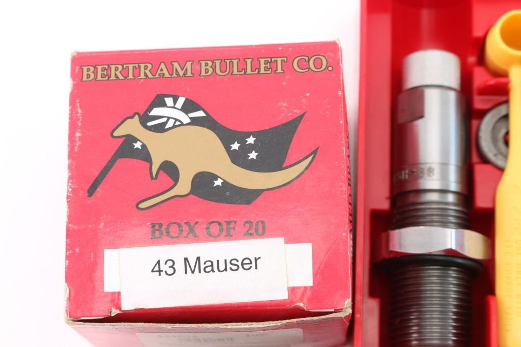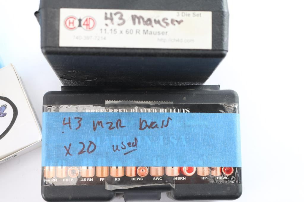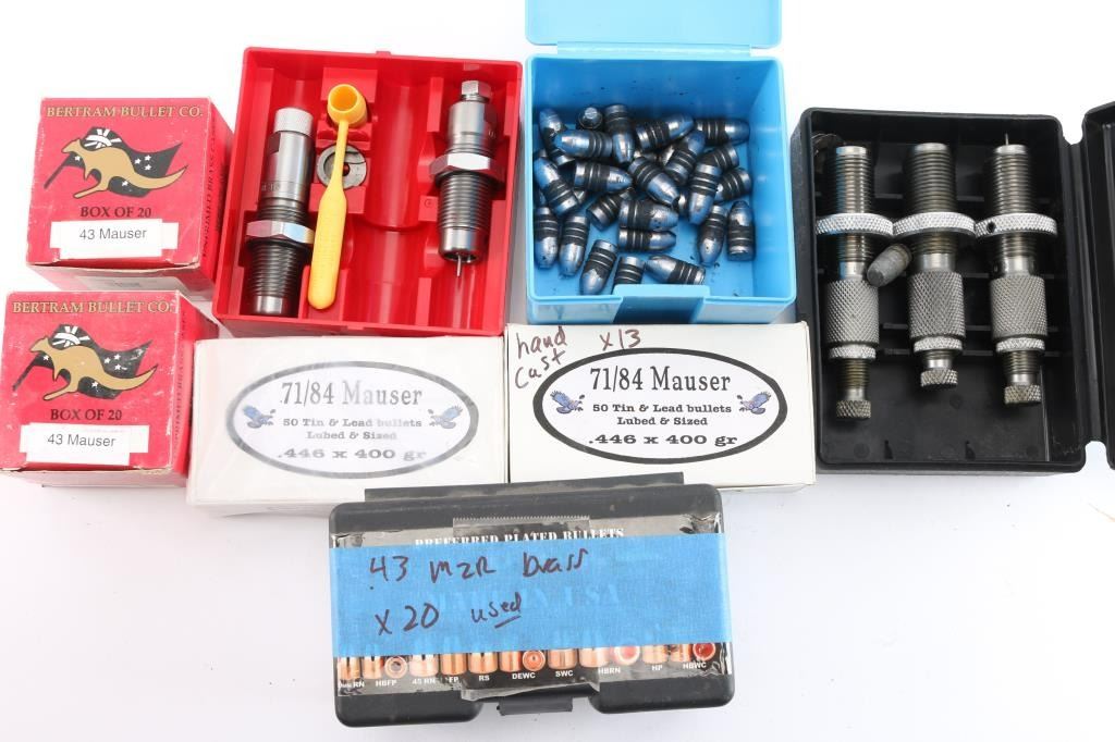 This lot includes .43 Mauser brass, bullets, and dies. The two die sets are from 'Lee Pacesetter,' and 'CH4D.' There are three boxes of bullets, one unopened box of 400 gr. '71/84 Mauser,' one of hand cast bullets, and a plastic box of miscellaneous 345 gr. bullets. Two boxes of unprimed 'Bertram Bullet Co.' brass, and one box of 20 fired brass cases in a plastic box. Included is a handloader's log.
