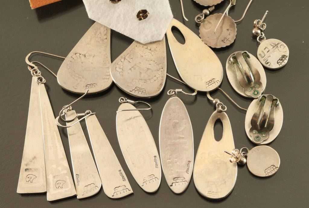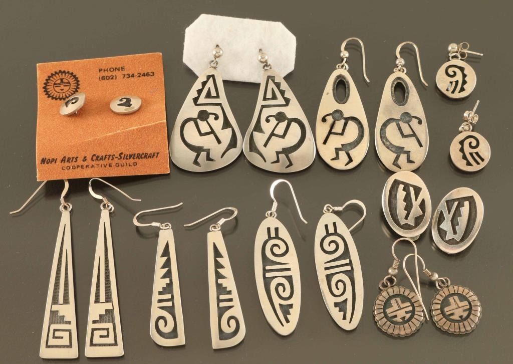 (5) Pairs maker marked Julian Fred all different designs (2) Pairs maker marked Hopi Silver Guild (1) Pair marked marked Trinidad Lucas (1) Pair of Sunface maker marked Mark Tawahongva From the Spike Flanders Collection Silver City New Mexico.