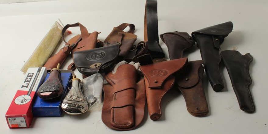 Lot of 11 military and commercial leather holsters, pouches, etc.; some original, some reproduction in varying conditions; also two reproduction powder flasks, a modern bullet mold and misc. parts. Est.: $150-$300.