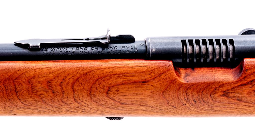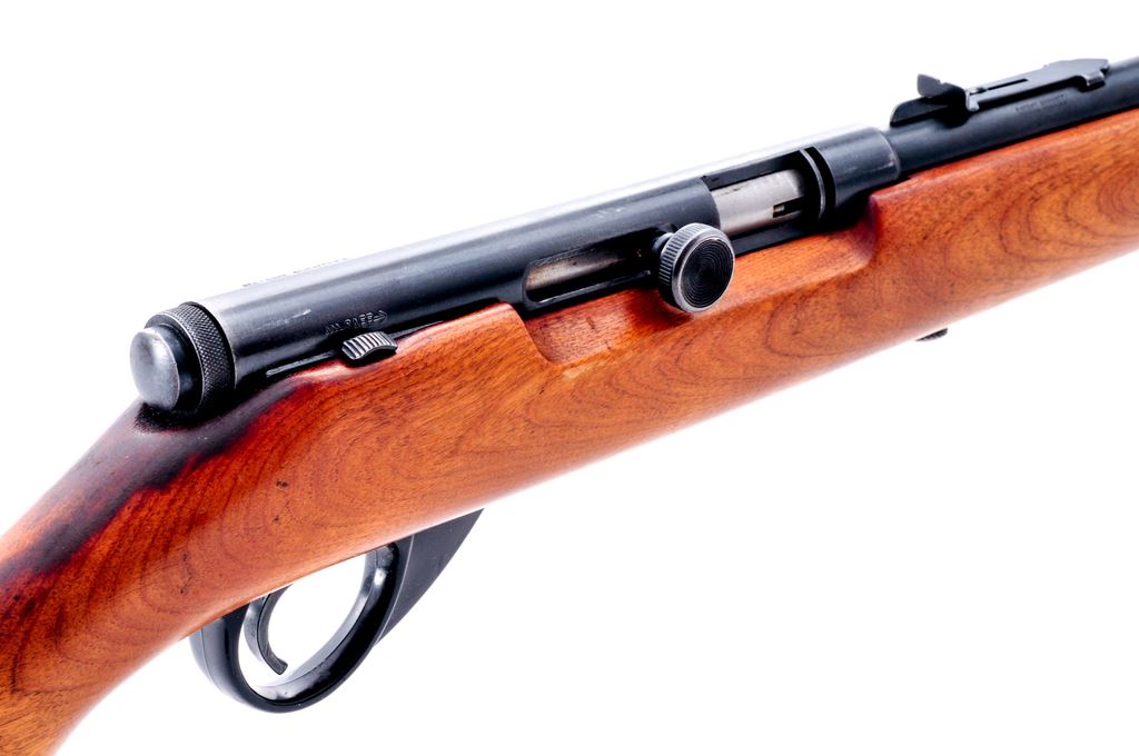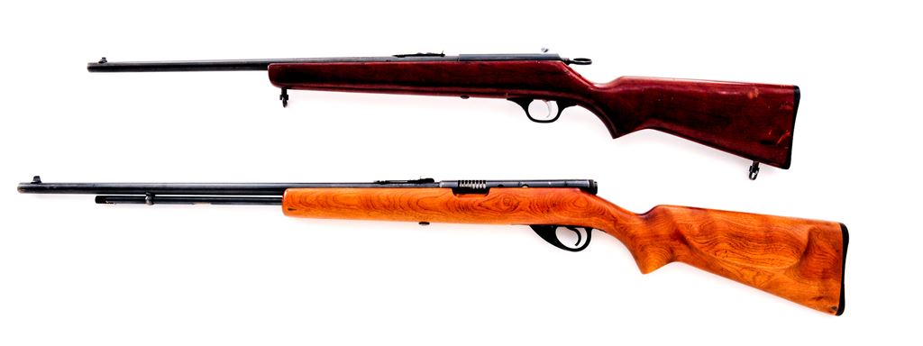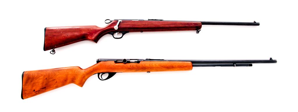 Lot of Two (2) .22 Caliber Rifles, Ranger & Glenfield: 1.) Ranger Model 101.16, NVSN, .22 S-L-LR cal., 24'' barrel, blue finish, hardwood stock, with standard sights. Condition is very good. Approx. 95%+ blue remains; receiver with some thinning; metal with scattered moderate handling marks. Wood with some small surface dents and scratches; added finish has been applied with darkening at the top edge of the wrist. Smooth action, fine bore. 2.) Glenfield Model 10 Bolt Action Rifle, NVSN, .22 S-L-LR cal., 22'' barrel, blue finish, pistol grip wood stock, sling swivels, with standard sights. Condition is good. Approx. 96% blue remains with some light spots of oxidation and small handling marks. Wood with general small impressions and scuffs. Fine action and bore. Est.: $150-$300/lot. (Both/C&R)