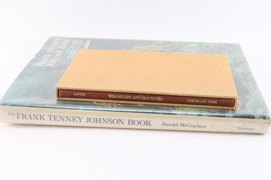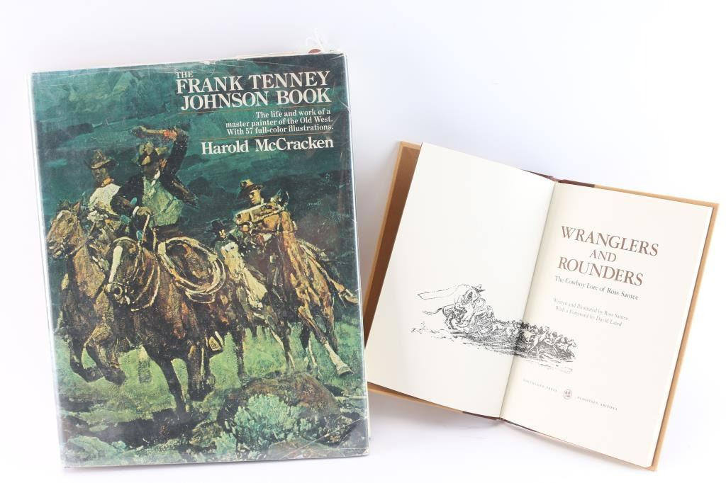 Includes a limited deluxe edition of Wranglers and Rounders, the Cowboy Lore of Ross Santee, 1981, # 20 of only 100. Excellent condition in slip cover. Also, Frank Tenney Johason book by Harold McCracken, 1974. Library copy marked withdrawn when sold. Good condition.