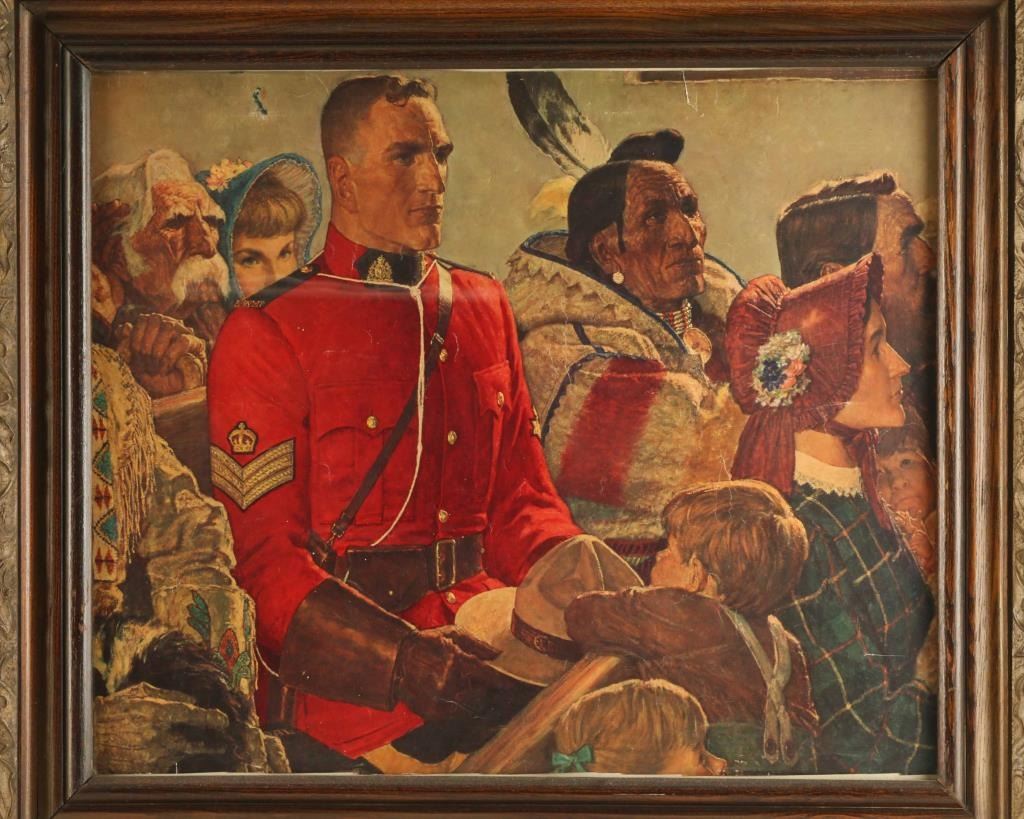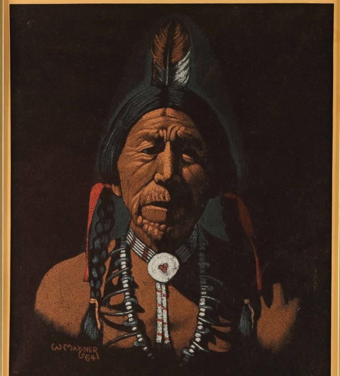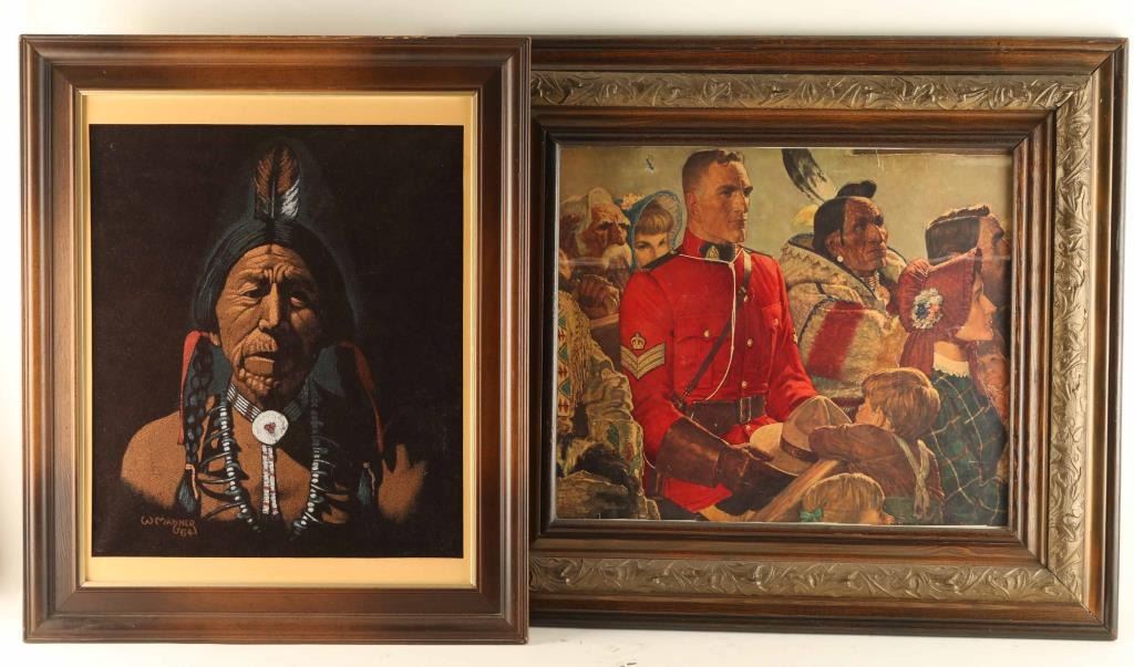 Includes (1) Portrait of a Native American man, paint on velvet, signed in the lower left hand corner "W Maqner, 64", framed with an image size of 14 1/2" x 17", and (1) frame print depicting a British Staff Sargent, a Native American, and others in a crowd, image size is 18" x 15".