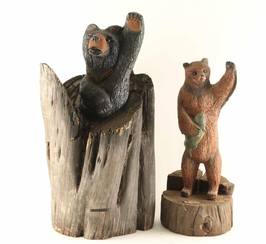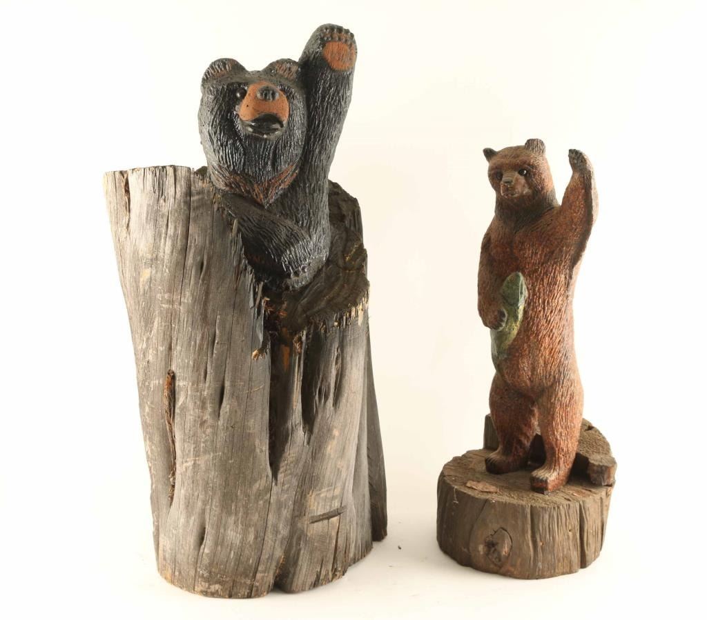 Lot includes (2) cast bears resting inside tree stumps. (1) Depicts a bear standing on back legs holding a fish, measures 9" x 9" x 22". (1) Depicting a bear coming out of the stump waving, measuring 13" x 27" x 9".