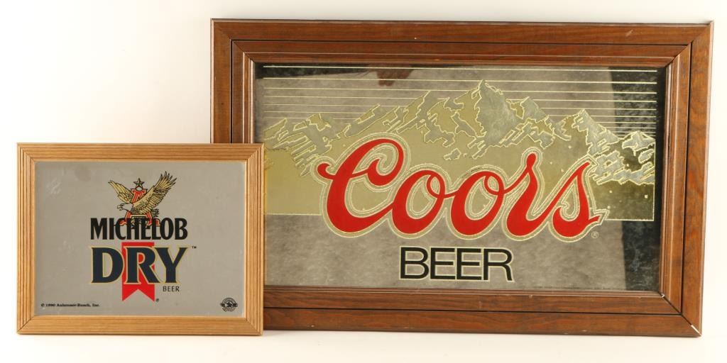 1 Michelob Dry in wood frame-13 3/4"x10 1/2" and 1 Coors Beer with gold mountains in the background, also in wood frame-27 1/2"x17 1/2".