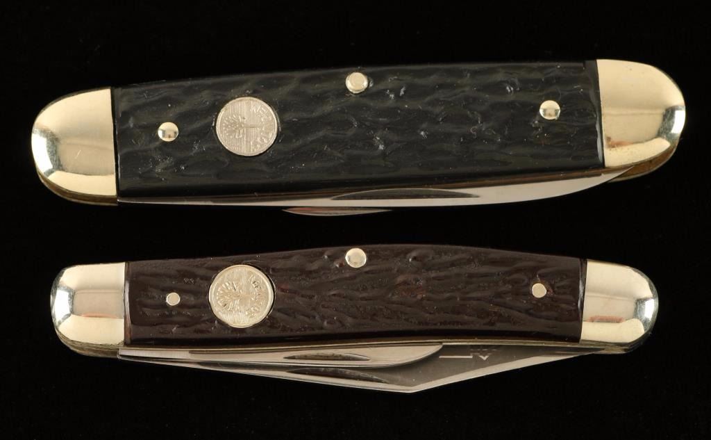 (1) two blade knife with black bakelite bone handle and 'Tree Brand Classic' etched blade. (1) two blade knife with black bakelite bone handle and "Solingen' tree logo, blade is unmarked, measures 3 3/4" closed. Made in Germany with Solingen steel blades. Vintage, never carried or sharpened.