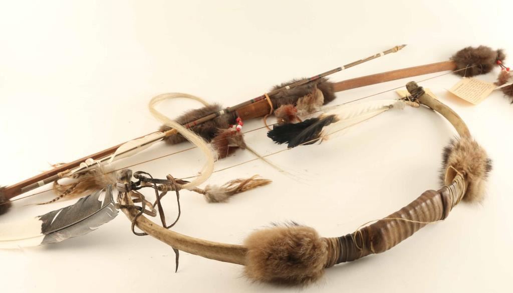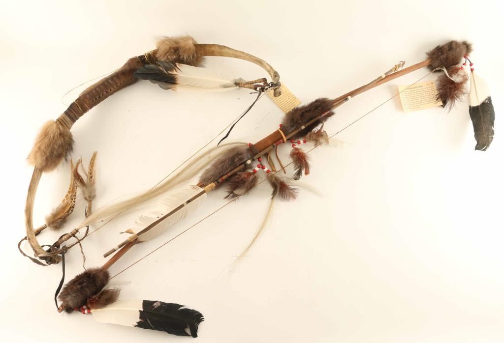 Camanche bow and a buffalo bow. Both are high quality reproduction accented with feathers real fur, hide, and other materials.