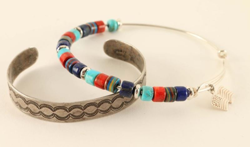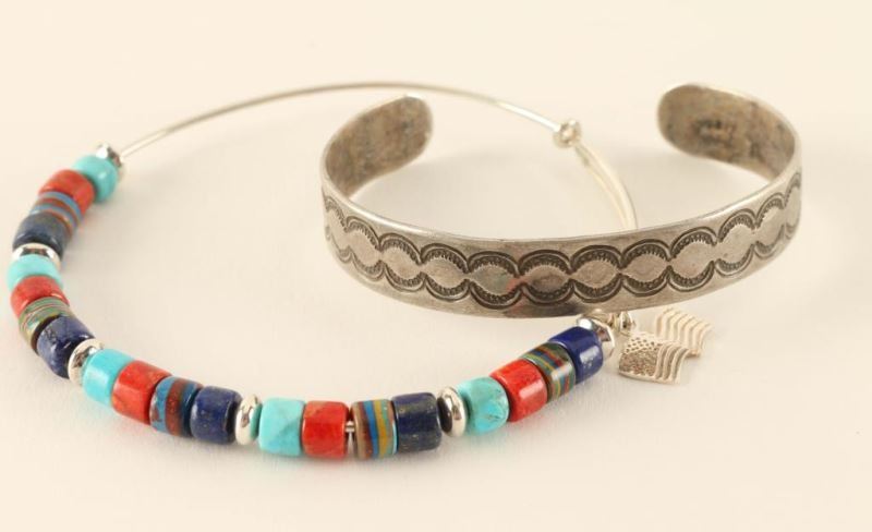 (1) Old Pawn handmade turquoise silver cuff bracelet with etched scallop design, unsigned. Inside measures 2 1/4". (1) Patriotic silver, turquoise, lapis and calsilica bead bangle with US flag charm.