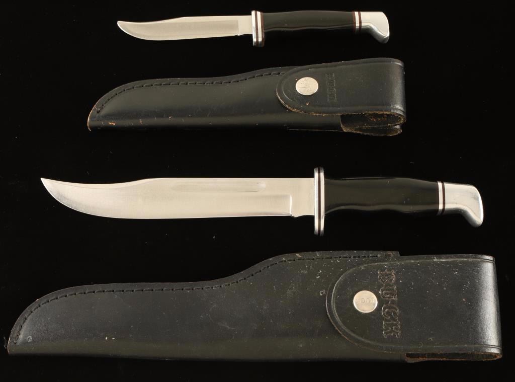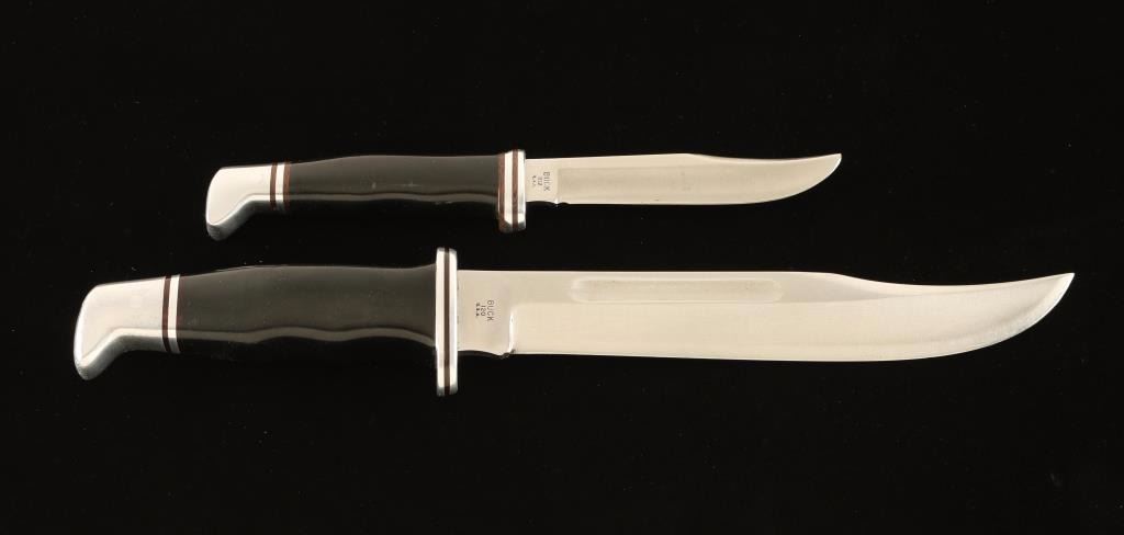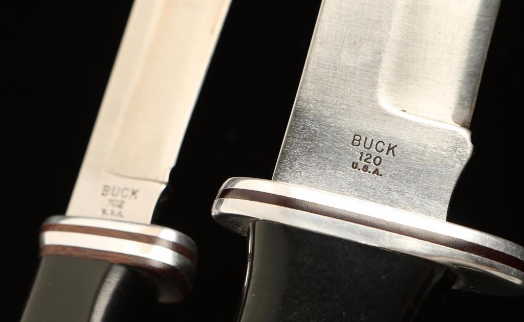 Buck 120 measures 12" overall with a 7" blade and includes a Buck brand sheath. Buck 102 black handle measures 8" overall with a 4" blade and also includes a Buck brand sheath.
