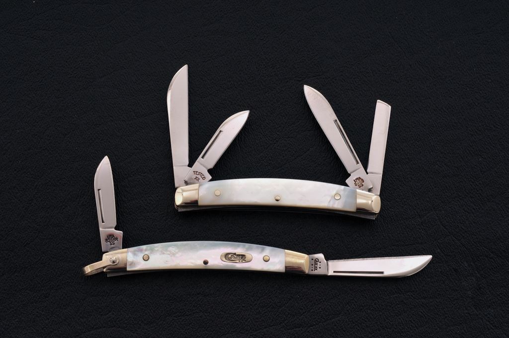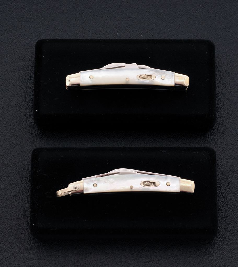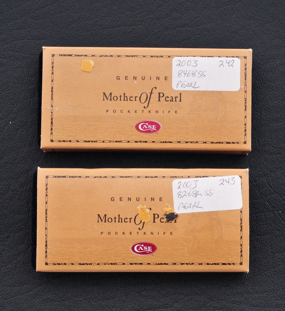 Lot of Two (2) Case Mother of Pearl Series ''Congress'' Folding Knives, including: 1.) Model #8468 SS, with pearl handles. Mfg'd 2003. 2.) Model #8268R SS, with pearl handles and bail. Mfg'd 2003. Each knife comes in its original black velvet case with correct slip cover. Both are in excellent as new condition, never carried or sharpened. Est.: $200-$300/lot.