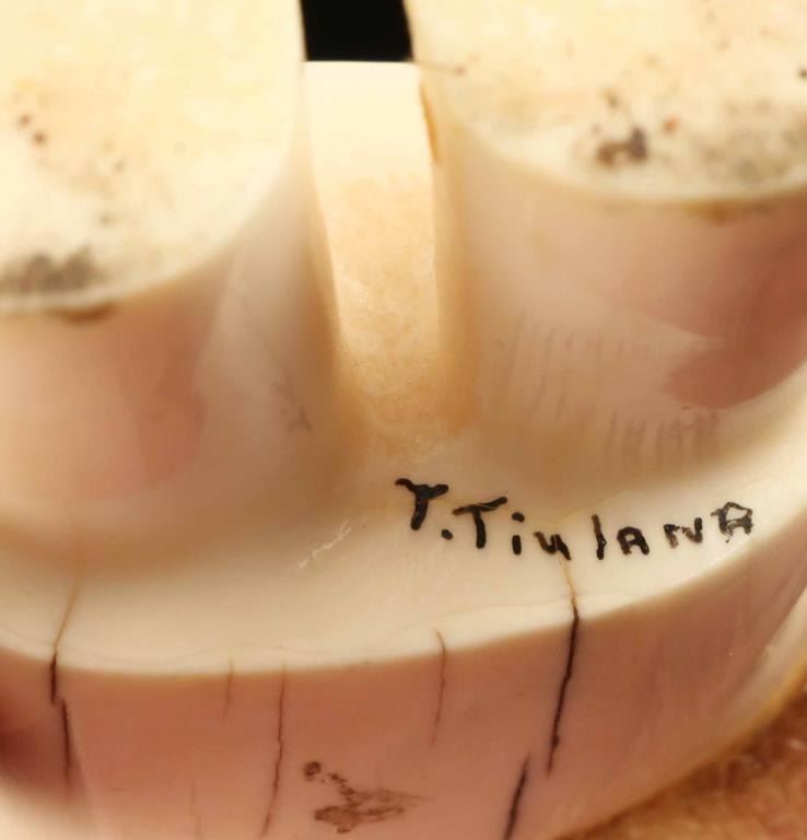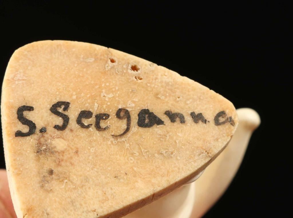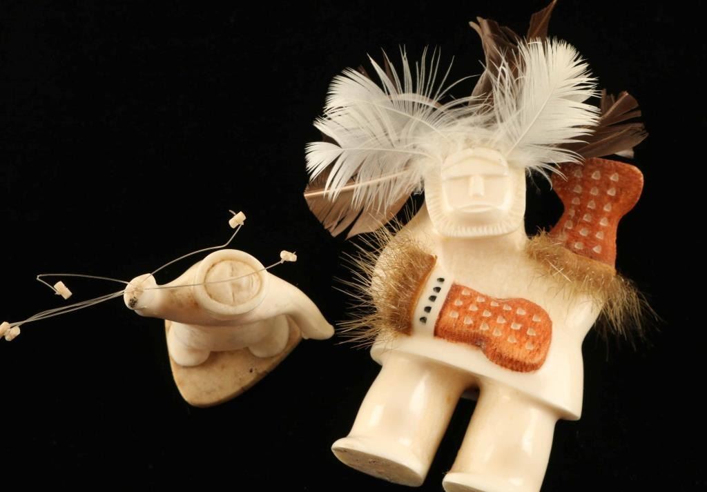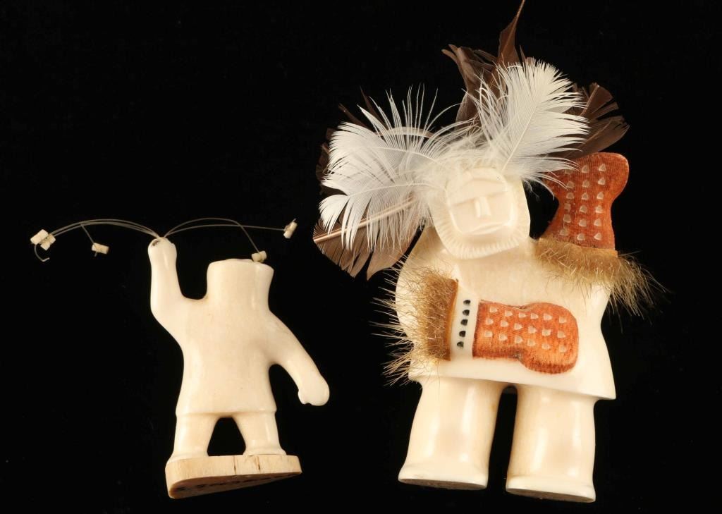 carved cabinet figures. 1. Carved figure of Eskimo man in winter garb with colored mittens and feather and fur enhancements. 2. Older walrus ivory carved figure on man in parka signed “S. Seeganna”. Measures 2” tall.