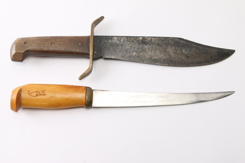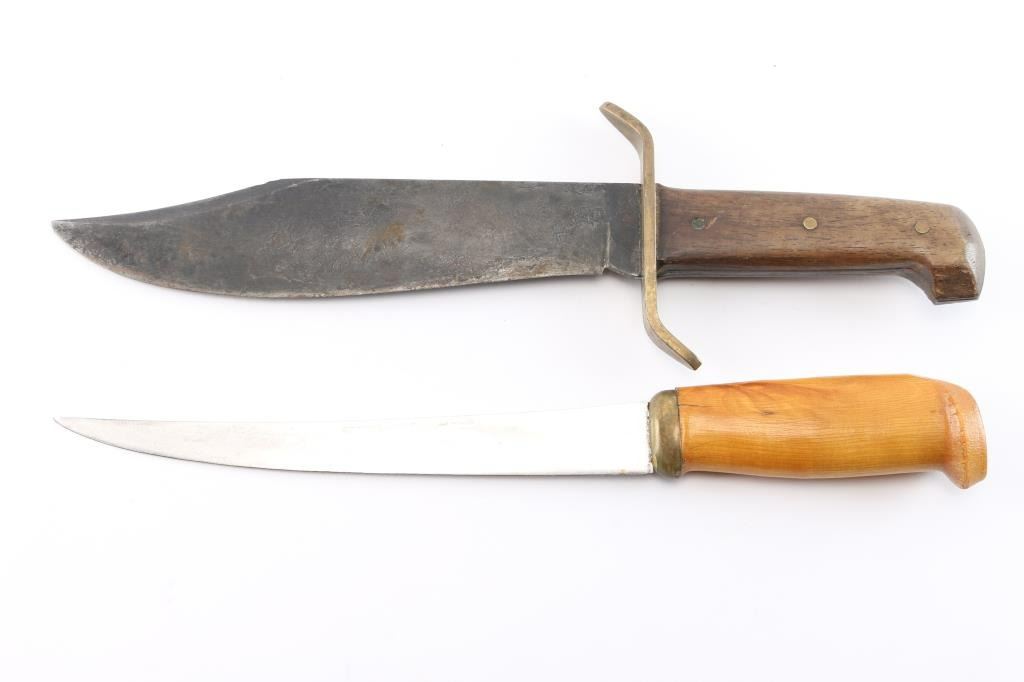 (1) Western Bowie knife, 8-3/4" blade, 14-1/2" overall. (2) J. Marttini Finland filet knife, 9" blade 13-3/4" overall