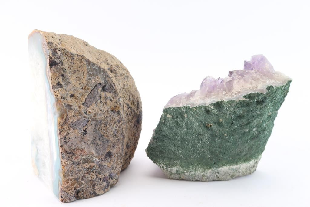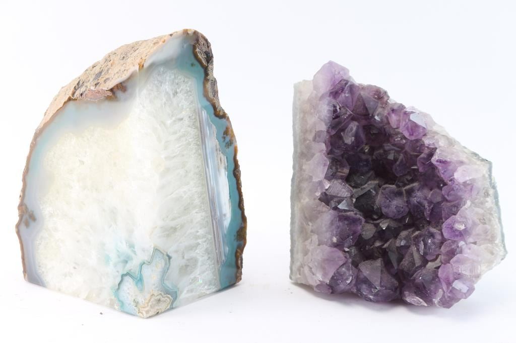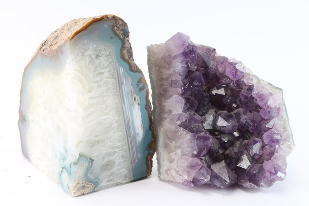 One is purple amethyst and measures 6" x 6", the other is white crystals with blue tones and measures 7" x 4 3/4".
