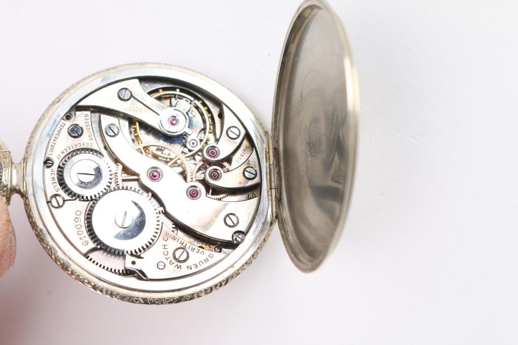 1) Gruen 'verithin pocket watch, 17 ligne, 17 jewel circa 1870. Gruen/Wadsworth 14K gold reinforced with metal case. In good working order. 2) Gruen guild, 17 jewel semi-thin, octagonal 25 year Wadsworth case. "MTK" engraved on the back of case. In good working order. Both size 12.