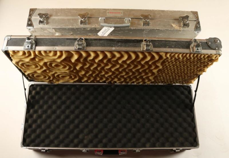 One by Winchester the other by Guardforce. Heavy duty metal Guardforce case with two foam lined section with wheels. Winchester case has single foam lined interior.
