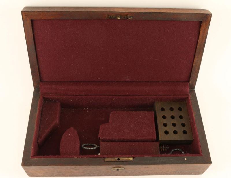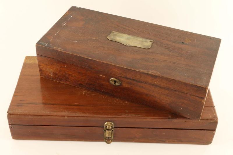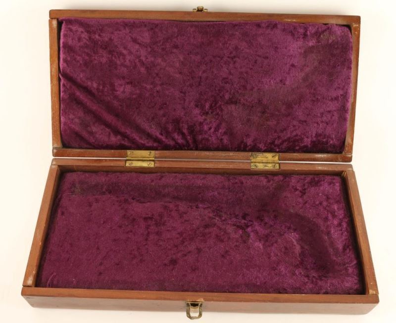 Both wooden, one is set up for a Buntline with purple crushed velvet, other appears to be set up for Merwin & Helbert.