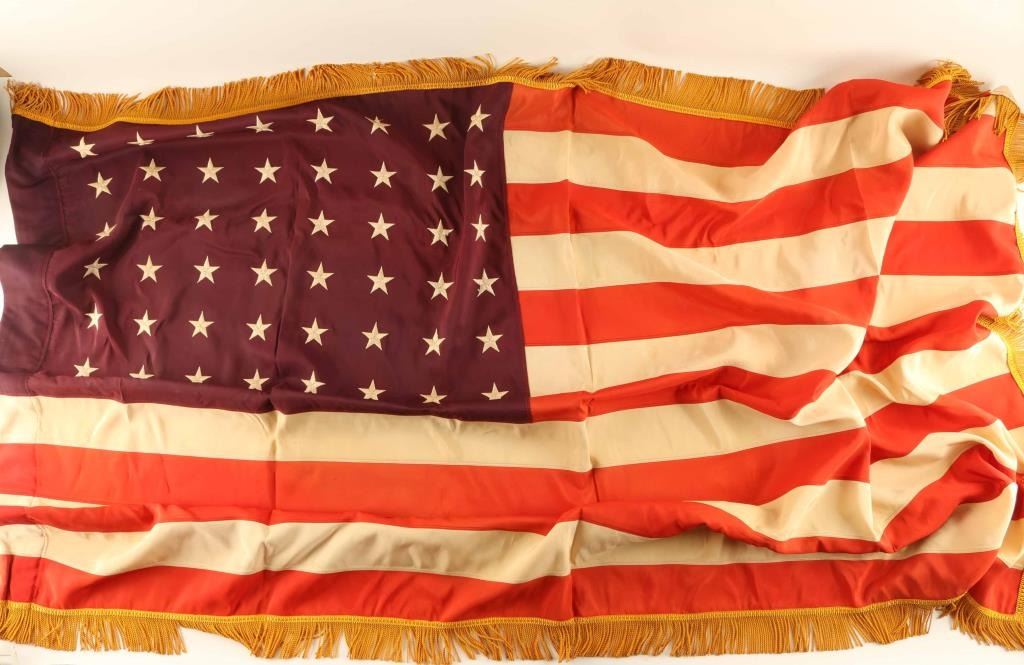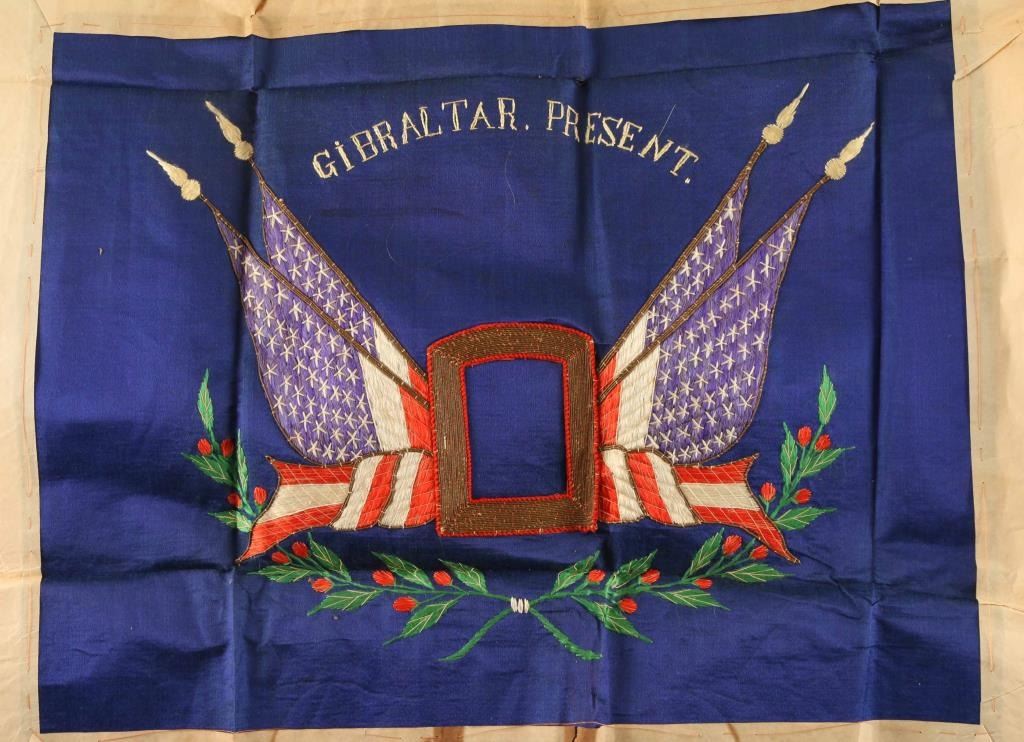 including silk 48 star American flag with gold fringe and a WWII GIBRALATAR President embroidered fabric piece shows large "O" with flags.