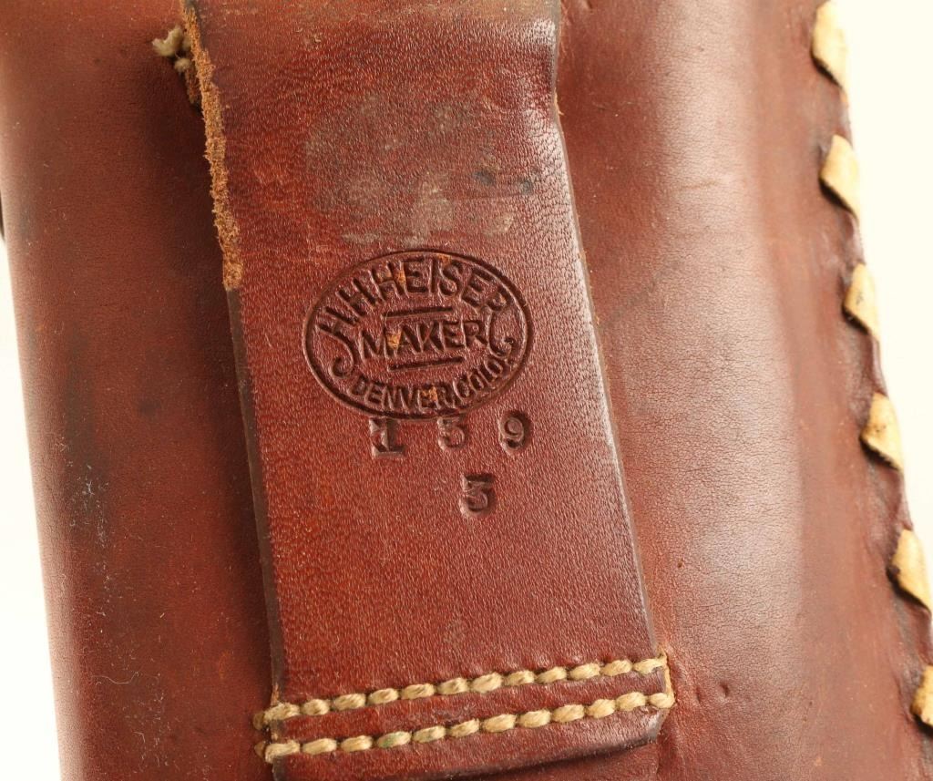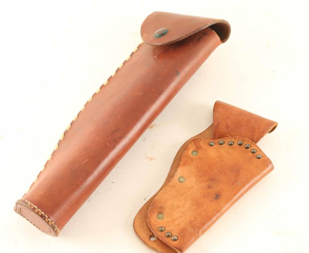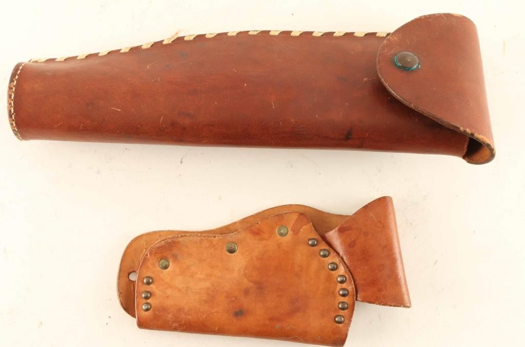 (1) H.H. Heiser Maker Denver Colorado, which appears to be a cutdown rifle scabbard. Also included is an unmarked small brown leather holster.