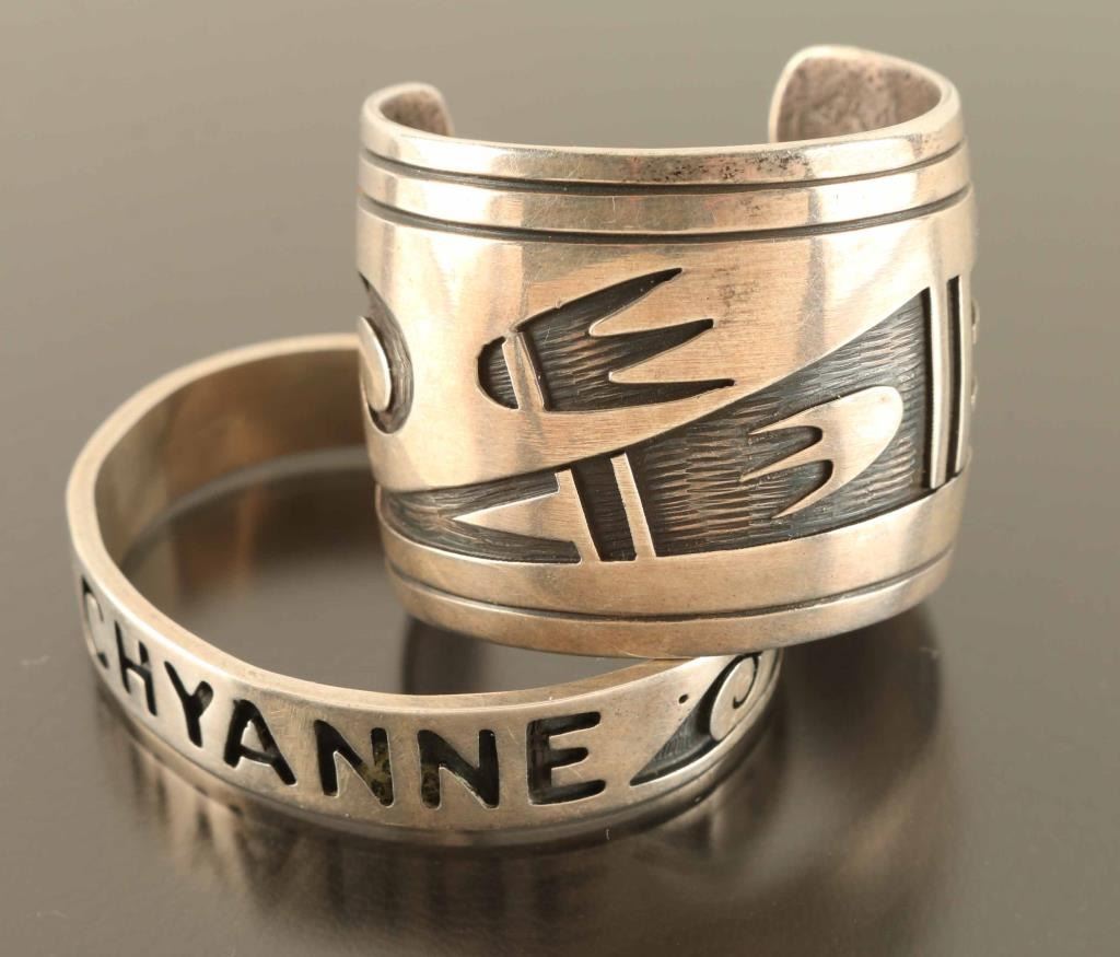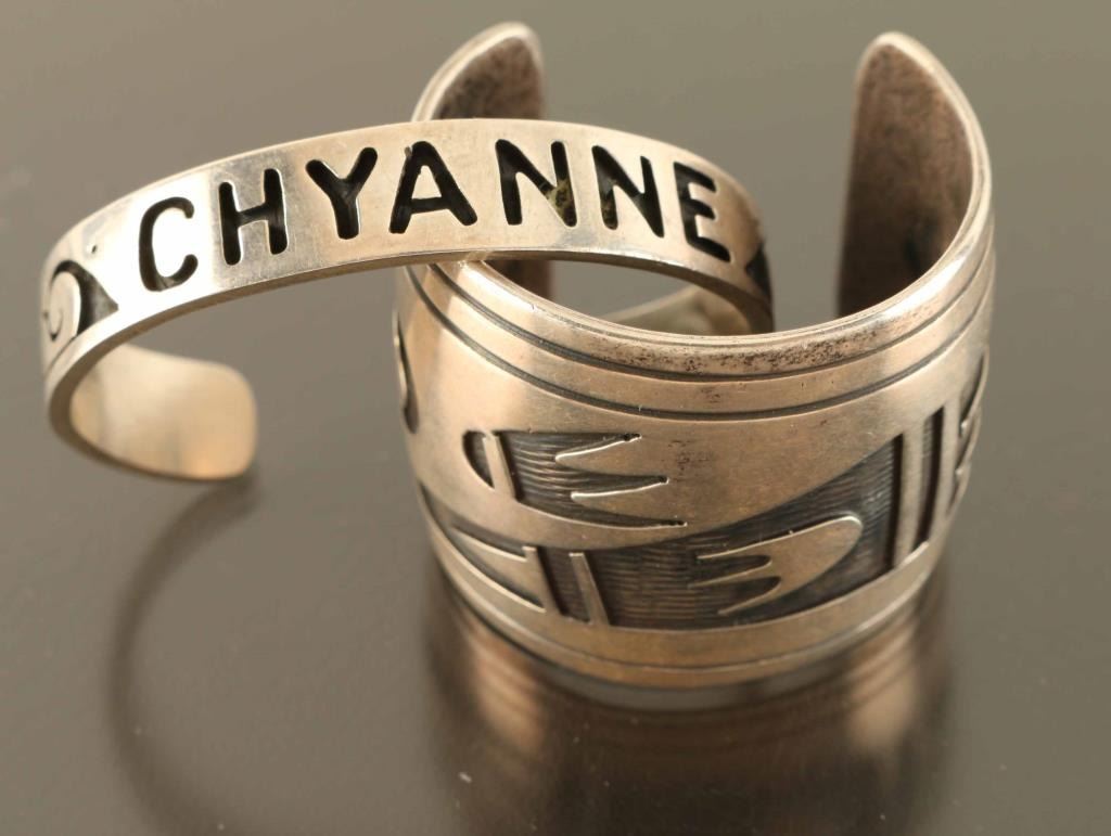 (1) Sterling with inlay geometric design with wave hallmark (1) Sterling "Chyanne" marked DLK