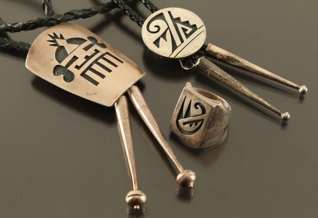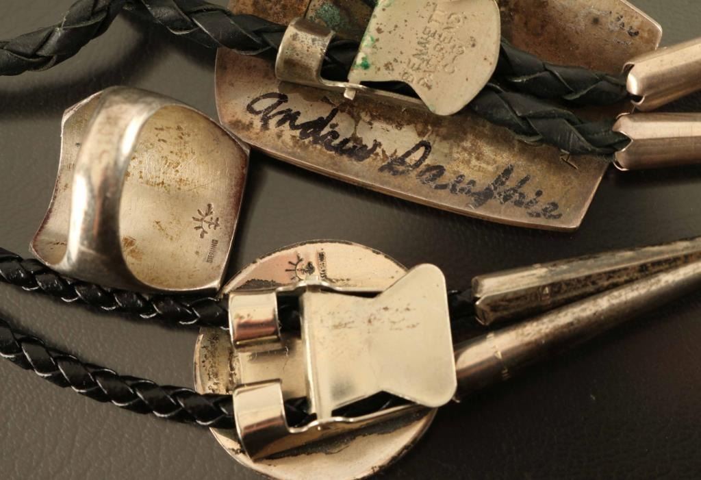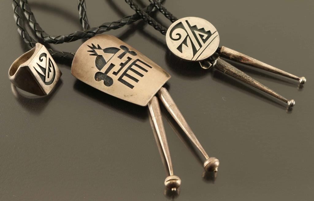 Mens Ring and two bolos all sterling. From the Spike Flanders Collection Silver City New Mexico.