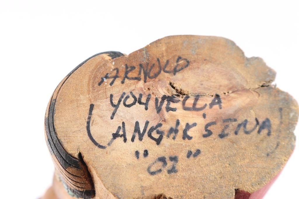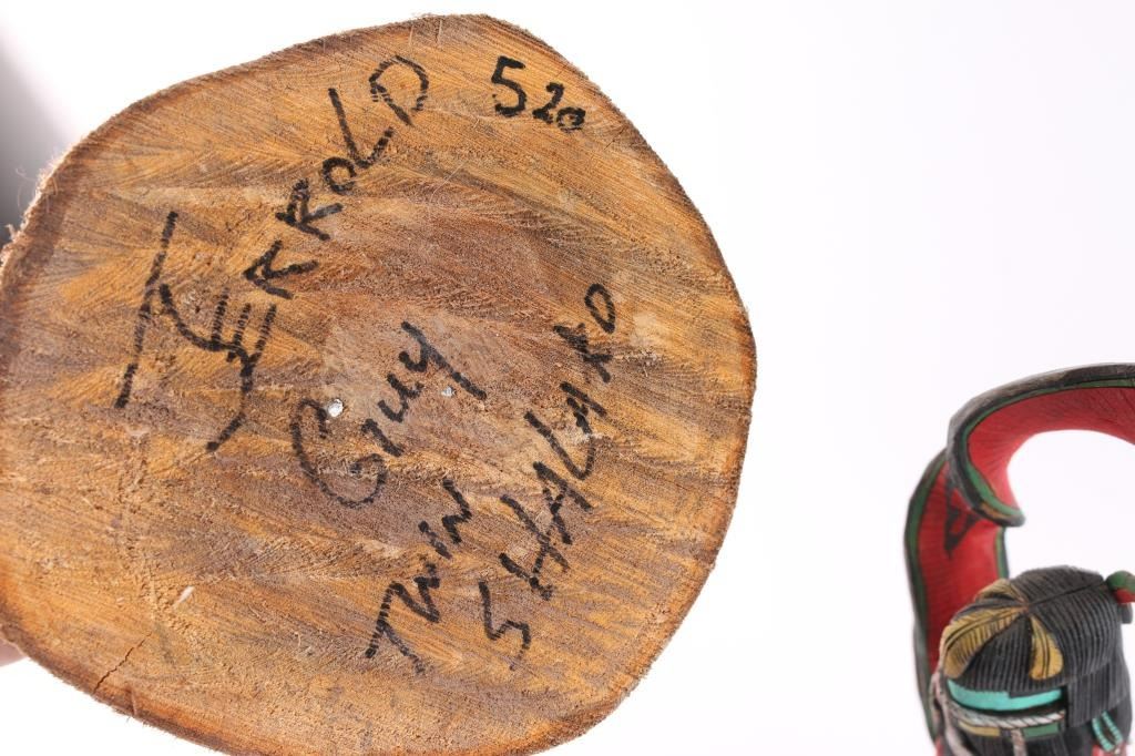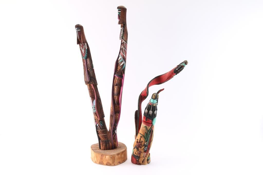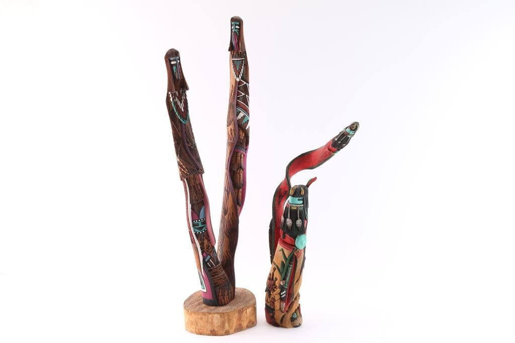 Two-headed kachina signed on base Arnold Youvella 19.5"T; and Twin Shalako by Jerald Guy measures 28".