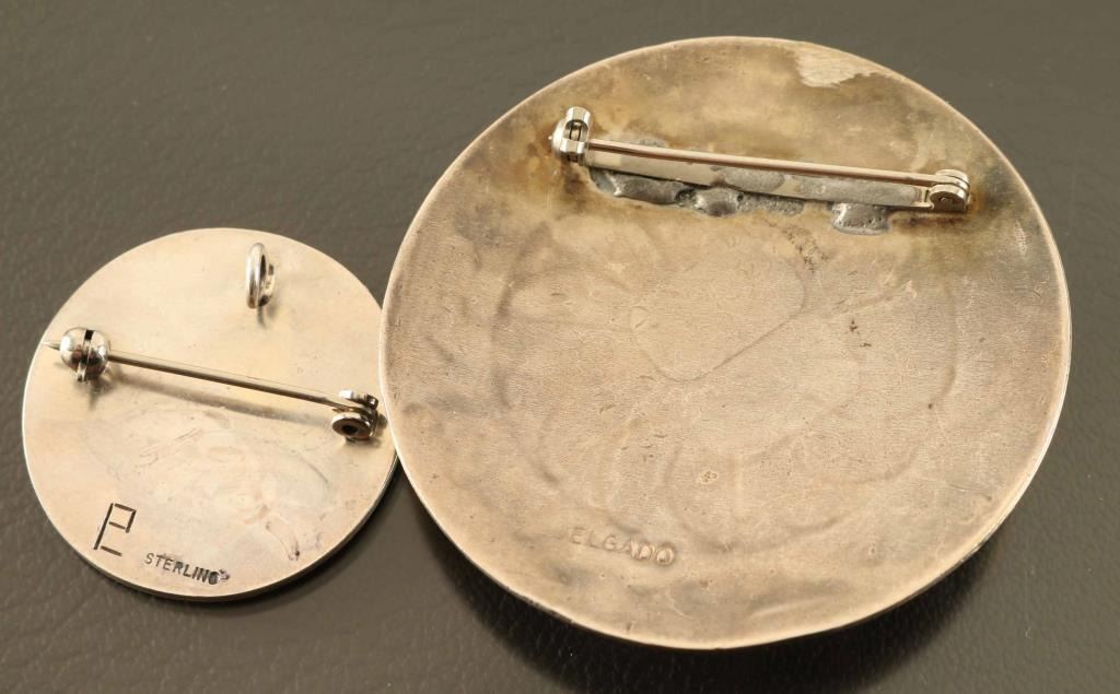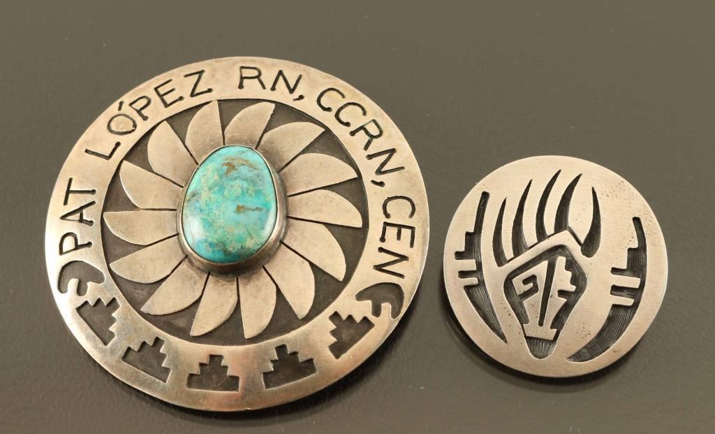 (1) Round Sterling pin with single turquoise stone reads"Pat Lopez RN, CCRN, CEN" (1) Bear Print Pin all sterling