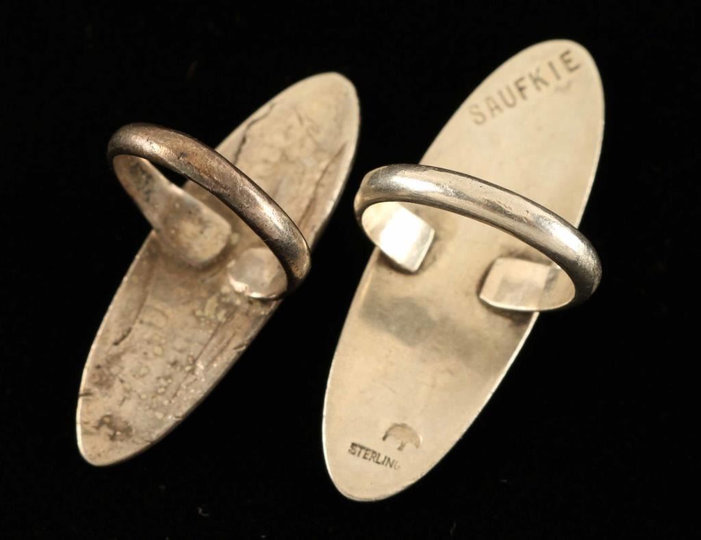 Both sterling both with inlaid geometric designs. Maker marked Lawrence Saufkie both have bear stamp. Bio- Lawrence Saufkie was born in 1935 and passed in 2011. He was taught by his father Paul and by Fred Kaboti who originated the Hopi style of silversmithing in the 1930s. A member of the bear clan, he was a pioneering silversmith for over 60 years. He won the SWAIA lifetime achievement award and was named an Arizona living treasure in his later years. He is collected by many well known museums and received an award from the American Museum of Natural History