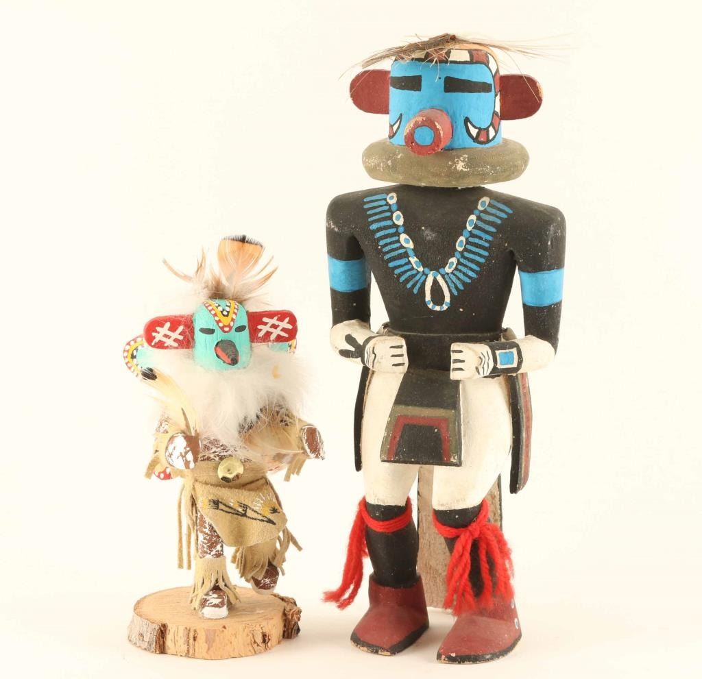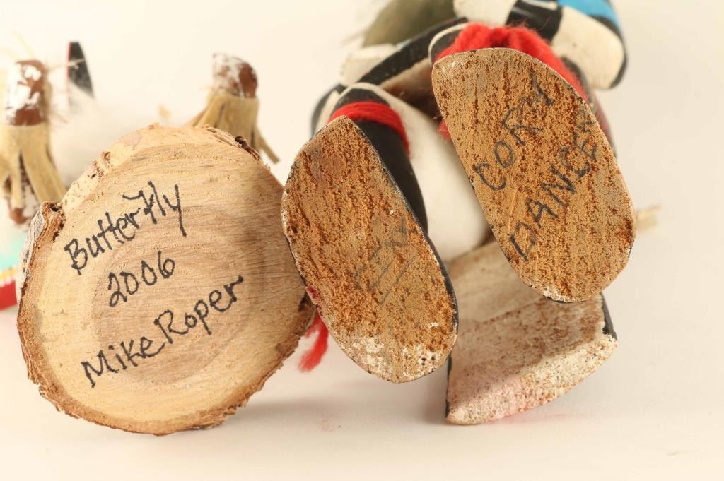 Includes (1) Corn Dancer Kachina signed on base but signature has faded, 9" tall, and (1) Butterfly Kachina signed "Mark Roper" 5" tall, beautifully done.