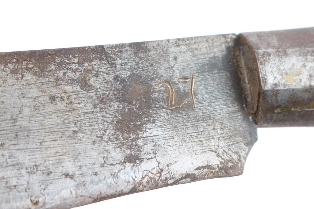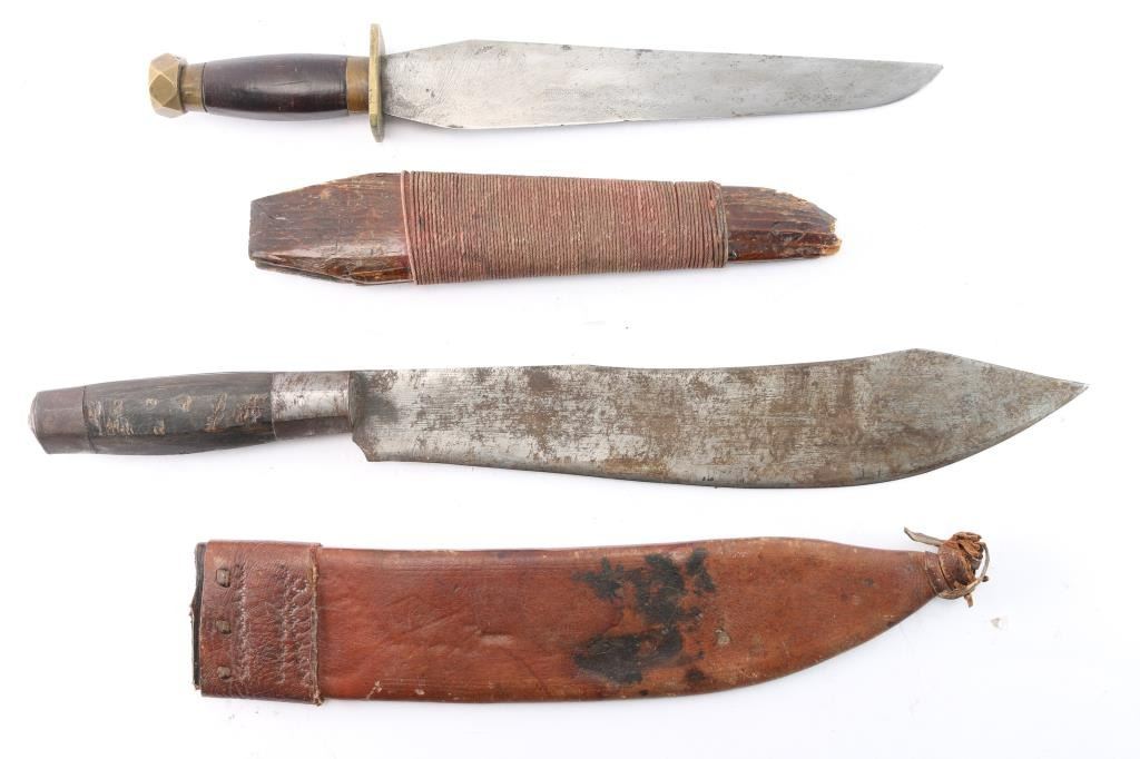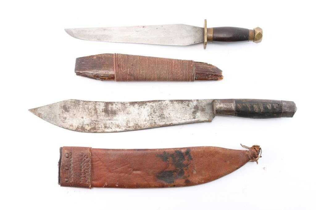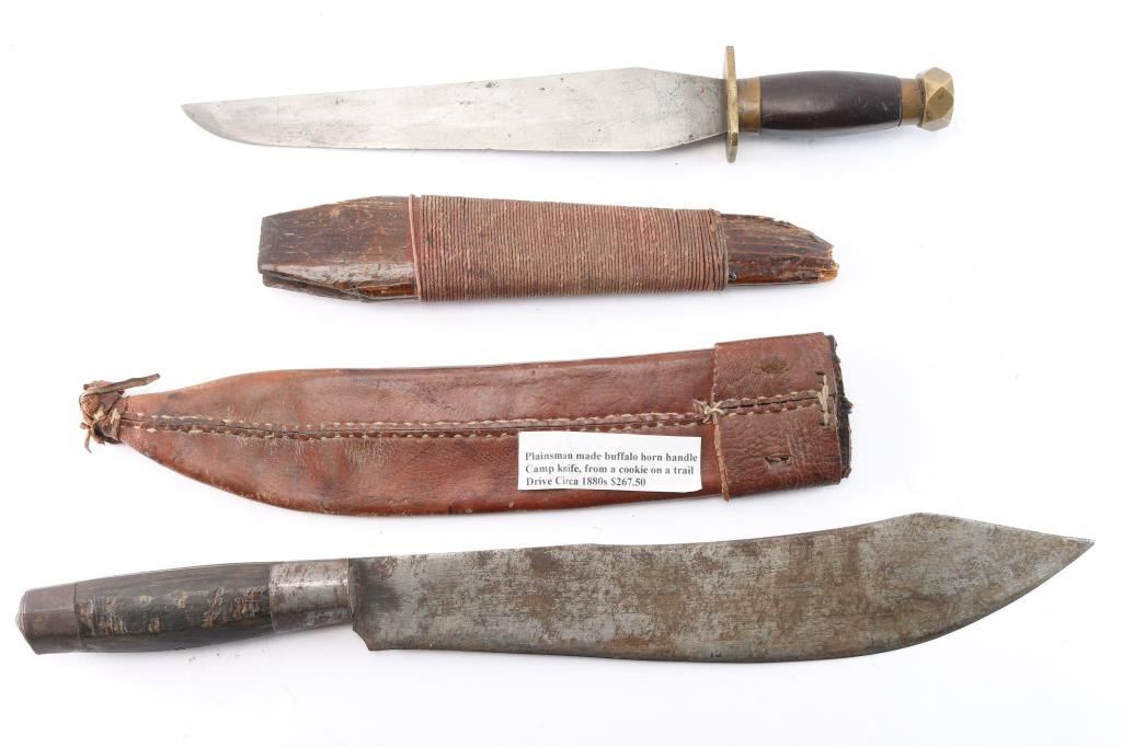 (1) Plainsman made, buffalo horn handle camp knife, from a cook on a trail drive. 1880's. 13" blade, 19" overall. Comes with leather sheath. Fixed blade knife with brass guard and pommel. 10" blade, 14-1/2" overall. Comes with wooden sheath wrapped with cord.
