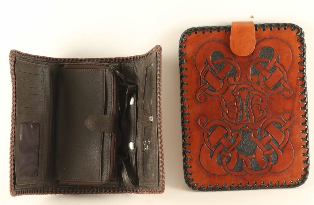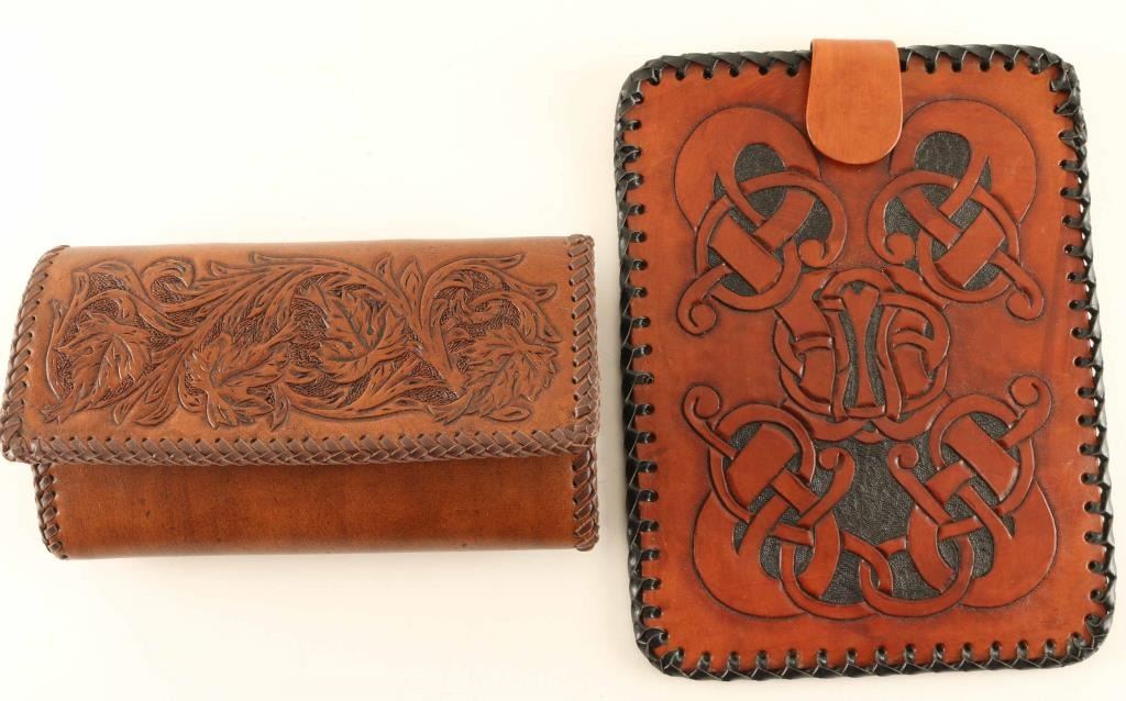 Includes a small tablet case with a diamond checkered design and an elaborate design on the opposite side. Also Includes a clutch purse with a shoulder strap, natural maple leaf motif design. All items are genuine leather from Arizona leathersmith Bill Myers.
