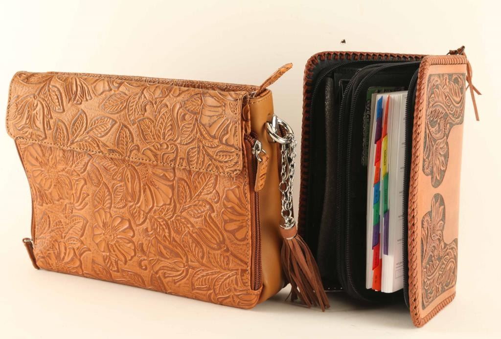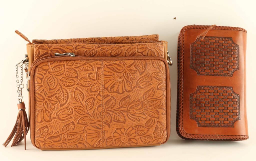 Items are genuine leather from Arizona leathersmith Bill Myers. Includes (1) Day planner with extra storage space for cards, coins, paper money, and an ID. The outside has a beautiful floral design on the front and a "brick" Pattern on the back, and (1) Concealed carry purse from "Gun Tote'n Mamas" and has a nice floral motif design
