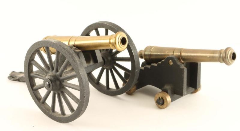 Both have brass barrels. 1 on a transport with two large wheels, the other with four small brass wheels.