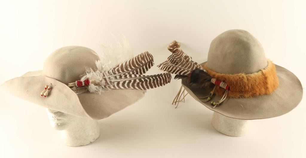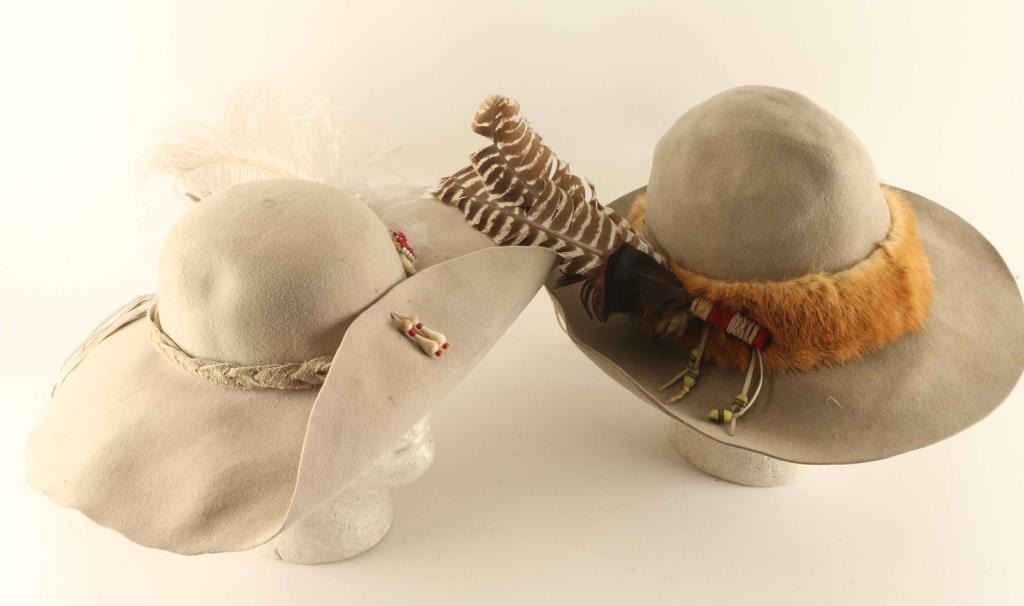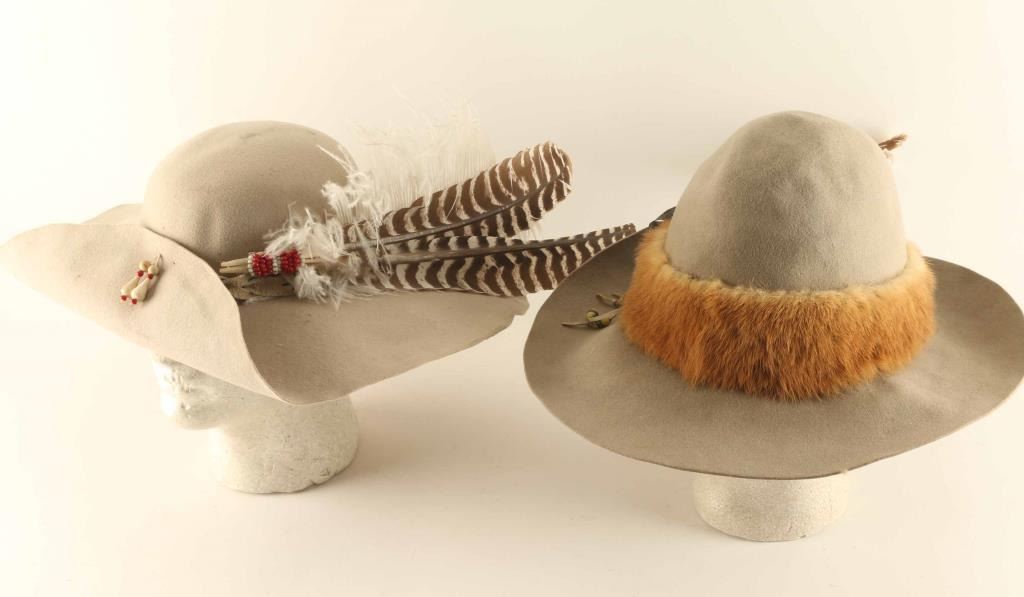 Includes an Anadero size 6 with fur hat band, feather, and beaded motif, and a Tan Felt Had with braided hand band.
