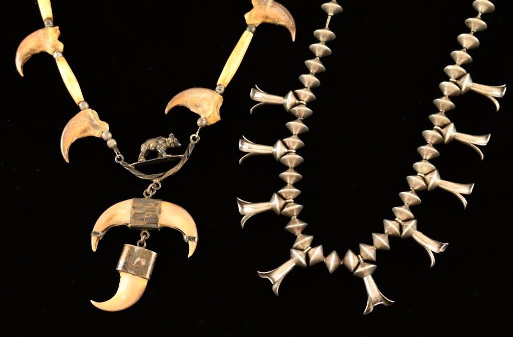Sterling silver squash blossom necklace approx. 17" long with hook and eye closure. Bear claw and bone necklace with silver fittings. Center of necklace has a metal bear figurine with a "bullhorn' drop that has another claw dangling from it. Hook and eye closure.