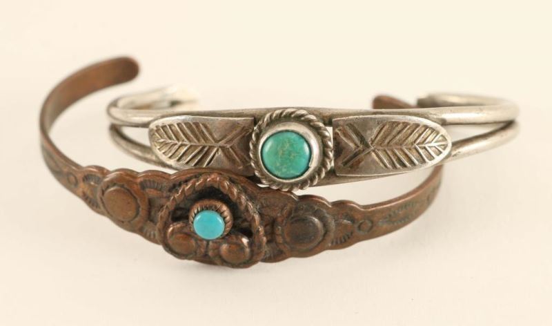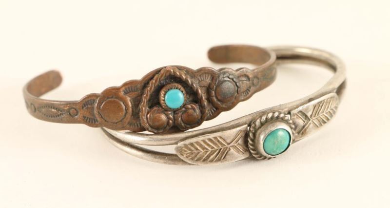 (1) Copper and turquoise cuff with heart design. Inside measures 1 7/8", unsigned. (1) Hammered silver and turquoise cuff with single round stone and feather design. Inside measures 1 7/8", unsigned.