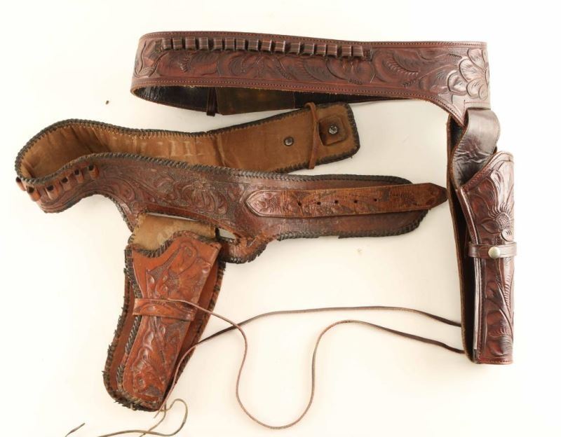 Both are brown tooled leather with a floral motif. One shows age and wear, size 34. The other is in good condition size 38-40.