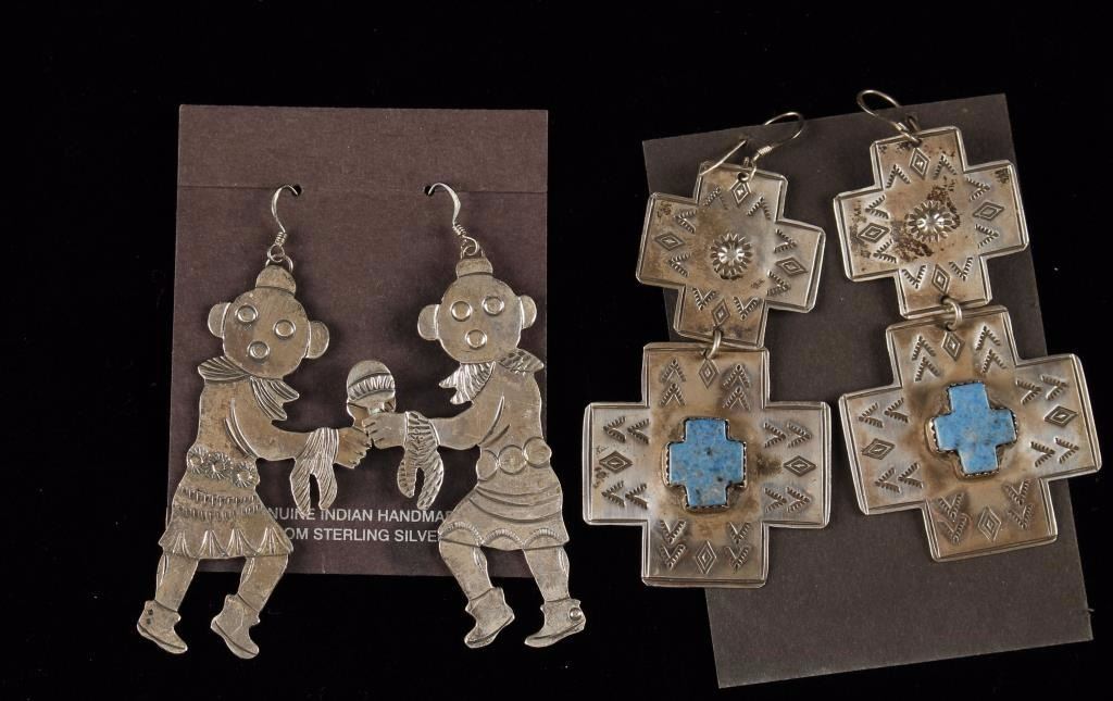 1 of Kachina Dancers and 1 Double Crosses with turquoise accents. Both dangle earrings on French wires.