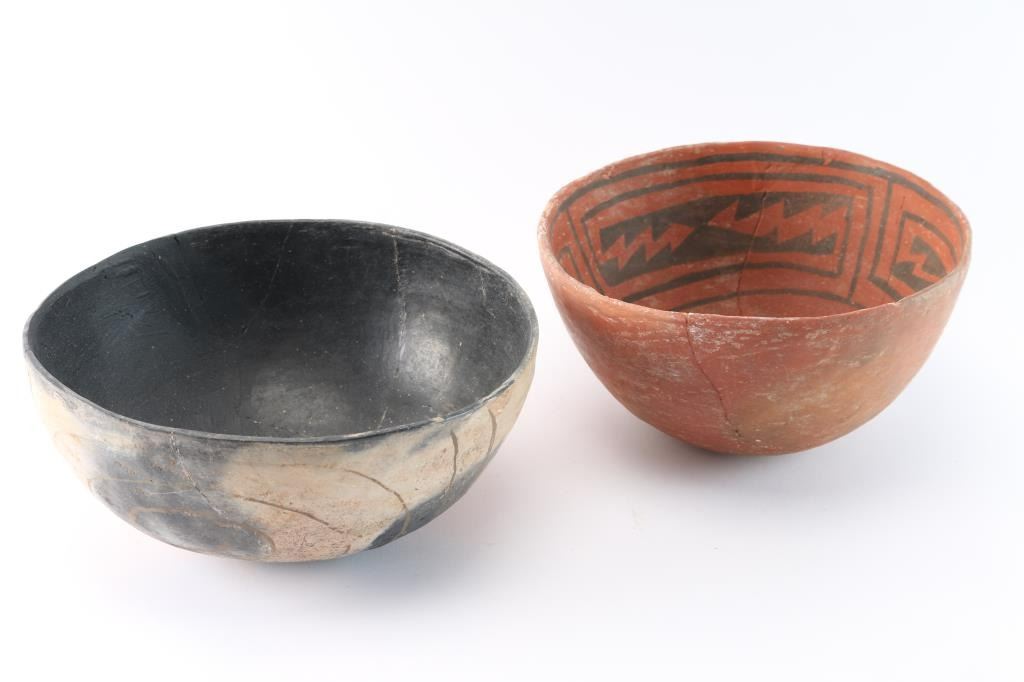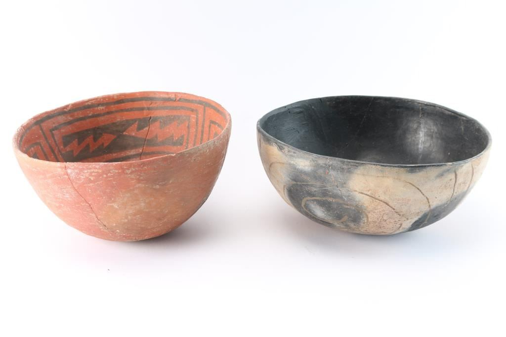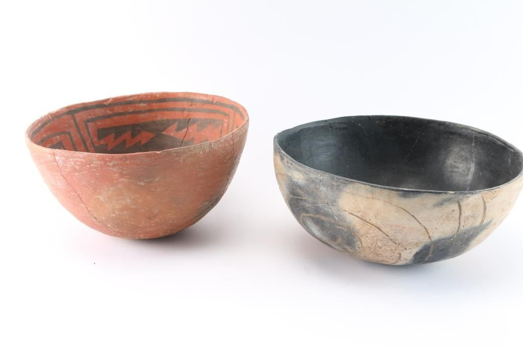 5"x9" redware with geometric design, and black lined plain wear pot. Both have been heavily restored.
