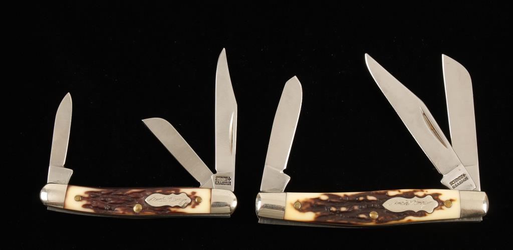 Models 807UH and 834UH. Lengths are 2-3/4" and 3-1/4" closed with 4-3/4" and 5-3/4" open respectively. Scales are Staglon. No boxes. Stamped "USA" on the blades with the model numbers. Condition is excellent.