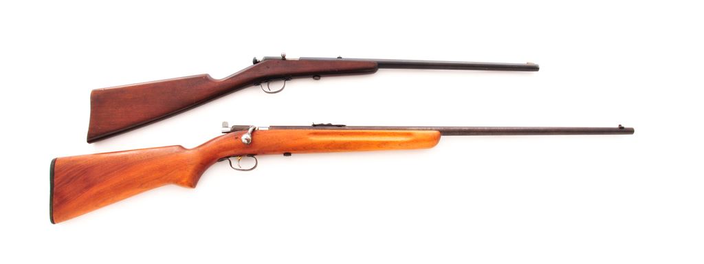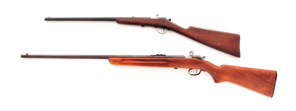Lot of Two (2) Single Shot Bolt Action Winchester Rifles: 1.) Model 58 Boys Rifle, NVSN, .22 S-L-LR cal., 18'' barrel, blue finish, straight grip wood stock, silver blade front sight, and dovetailed ''V''-notched rear sight. Top of barrel and bolt are both Winchester proofed. Condition is good. Metal surfaces are a combination darkening blue and light brown highlighted finish. Barrel address is clear and well defined. Wood with scattered scuffs and shallow scratches and the overall condition is consistent with the rest of the rifle. Left upper edge with a 3'' hairline crack that runs from the chamber to the rear of the receiver. Action is very good with an excellent bore. 2.) Model 67, NVSN, .22 S-L-LR cal., 27'' barrel, originally with a blue finish, pistol-grip walnut stock with finger grooved forend, black composition Winchester buttplate, dovetailed front sight, with standard elevator rear sight. Bolt is not complete as the cocking knob is missing. Metal rates poor to fair with overall speckled surface rust over a brown patina. Barrel address and Winchester proof marks are partially clouded by age and wear. Stock rates good with an older added light coat of finish and scattered moderate scuffs and handling marks. Bore is very good. Est.: $200-$400/lot. (Both/C&R)