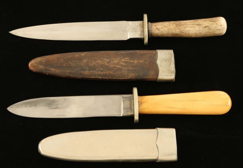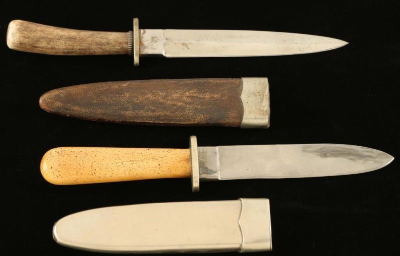 1 Hansen Cutlery knife with faux bone handle. Measures 8" overall with a 4" blade. Marked 'Hansen Cutlery'. Comes in silver metal sheath. 1 knife with faux antler handle, measures 8 1/4" with a 4 1/2" blade. Comes in leather and metal sheath. Both show use and wear. Good condition.
