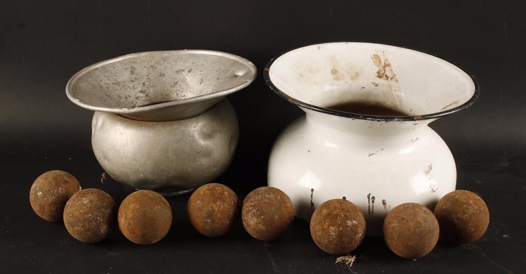 1 white enamelware, 1 tin. Includes white enamel jar which has antique cannonballs in it.