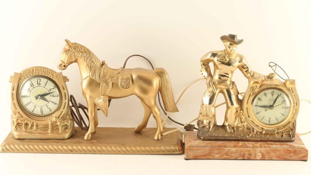 (1) Electrified United Clock with Cowboy (in working condition (1) Electrified Clock made by Lanshire in working order (1) Vintage Metal Horse Figurine