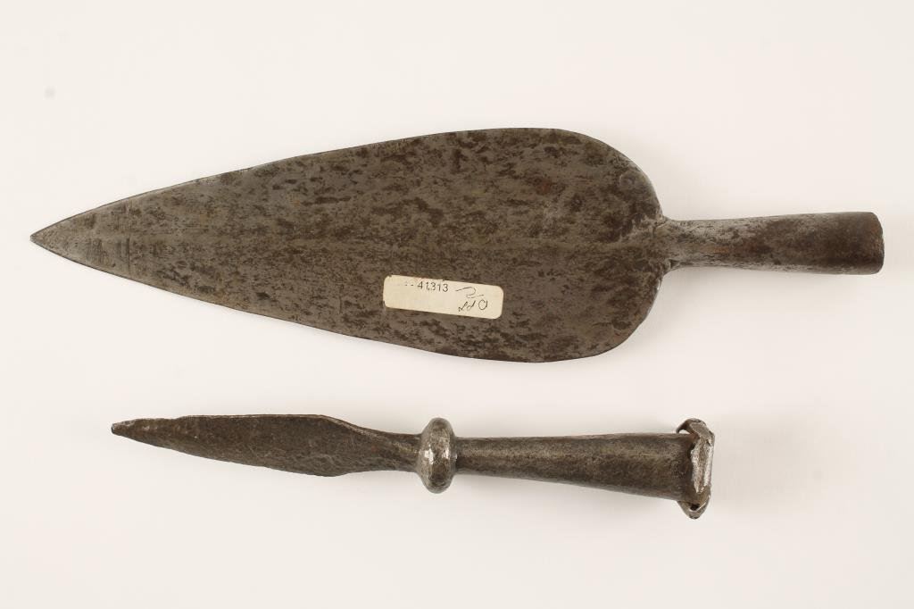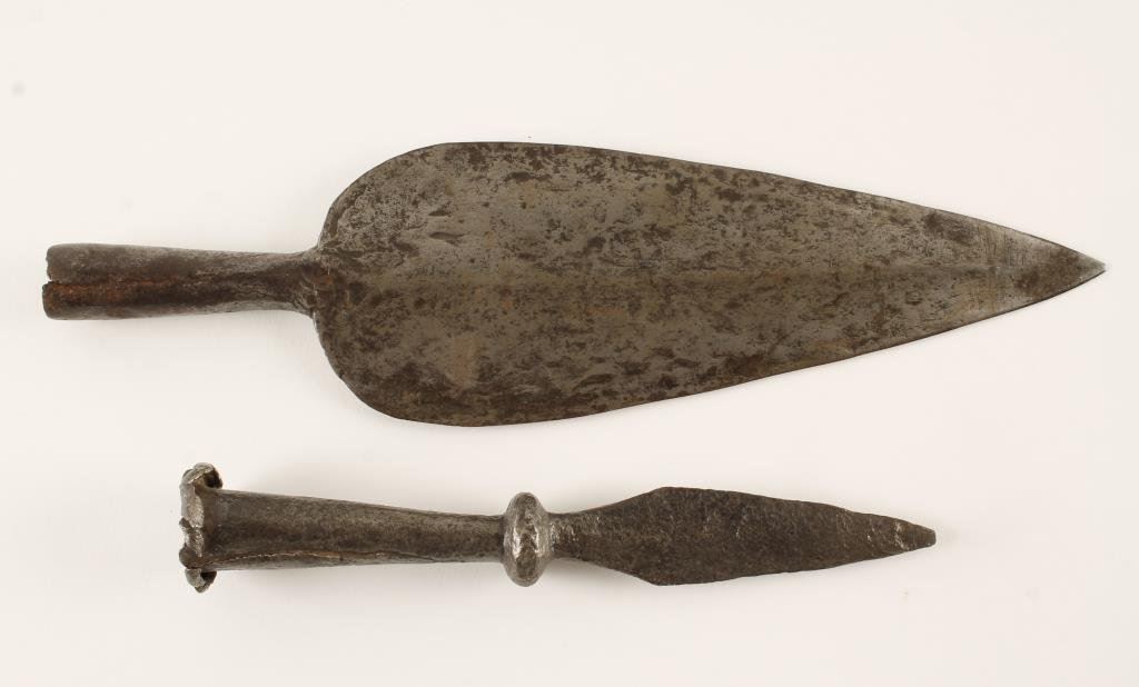 Lot of 2 antique collector blades including a 16th to 17th Century pole arm head approximately 13” overall with a 9.5” spade shaped blade and another ancient pole arm head approximately 9” overall with a 4.5” blade. Est.: $250-$500.