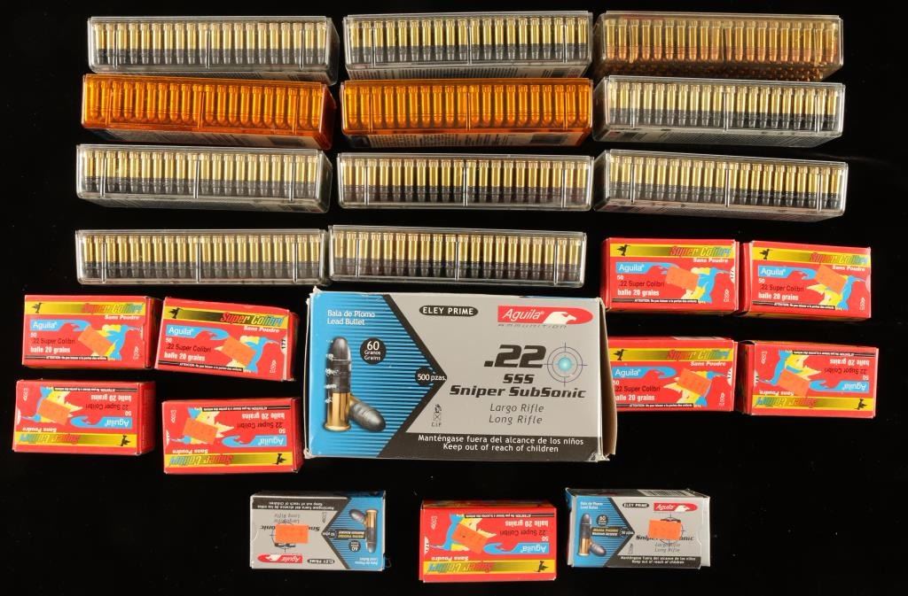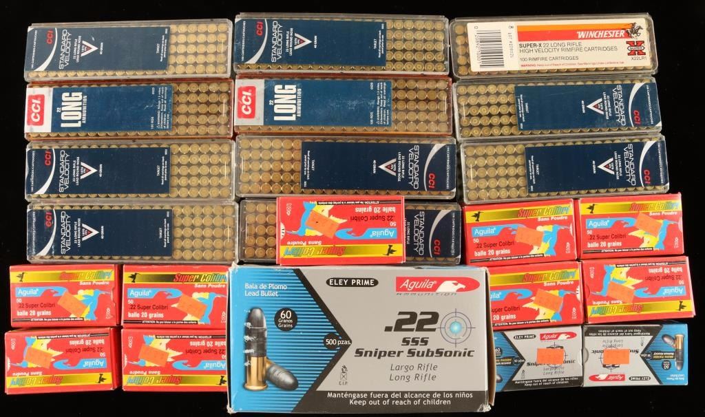 800 Rds of CCI 22LR Standard Velocity, 540 Rds of 22SSS Aguila, 120 Rds 22 Super by Aguila, 200 Rds 22LR CCI, 100 Rds 22LR Winchester. 1760 Rds total.