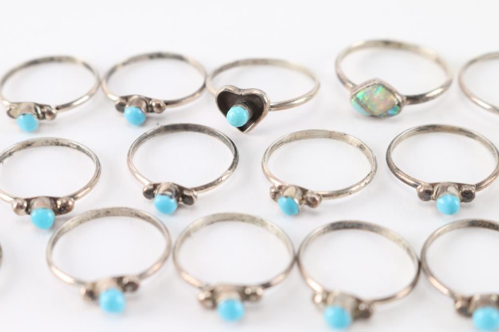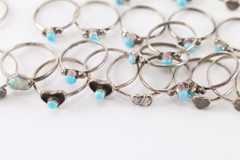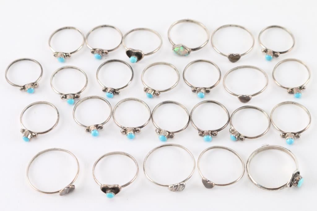 (16) Childs rings with bead of turquoise at center, size 1 3/4. (3) Childs rings heart-shaped with turquoise bead at center, size 3 1/4, 3 1/2 and 5 1/4.(1) Childs ring with opal heart, size 3 3/4.(5) Silver heart rings, size 3 1/4 to 6 3/4.